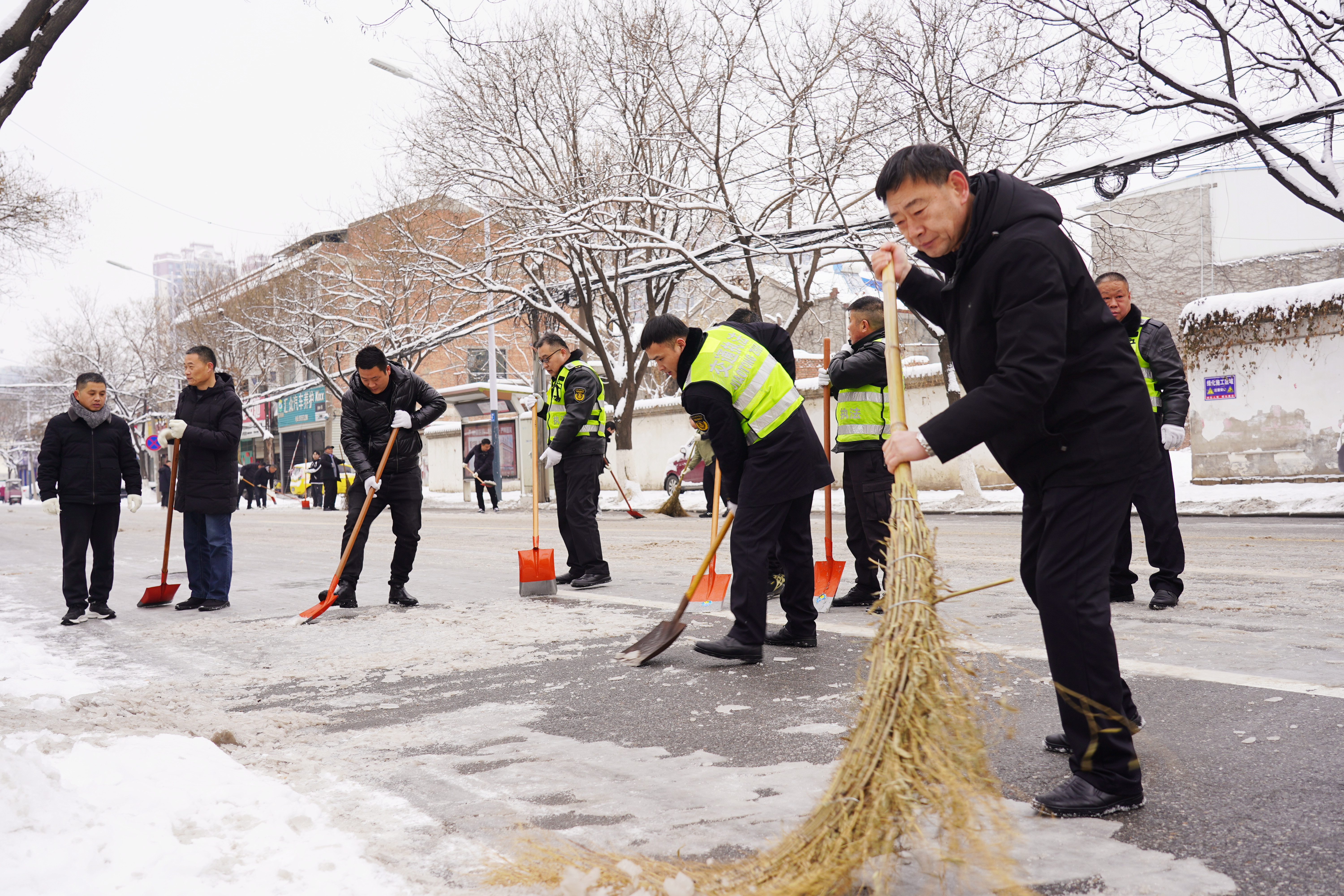 活动中,大家不畏严寒,按照分配好的责任区域,积极投入到清雪工作中。在烈山路与闸河路交叉口,有的积雪已被踩压成冰,铲除工作比较艰难,但这些丝毫没影响大家的劳动热情,依然精神饱满、干劲十足,拿起手中的清扫工具,铲的铲、推的推、扫的扫,分工协作,忙碌的身影在凛冽的寒风中形成了一道靓丽的风景线。经过数个小时的奋战,包保路段沿途两侧的积雪、积冰基本清扫干净,原本厚厚的雪地里清理出一条条干净整洁的便民通道。