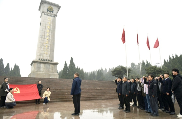 全体人员整齐列队来到烈士纪念碑前,肃立默哀,并向烈士纪念碑三鞠躬。随后全体党员在鲜红的党旗下,高举右拳,重温入党誓词,铿锵有力的誓言回荡在陵园上空,唤醒了每一位党员的初心与使命,进一步强化了党性观念和责任担当。