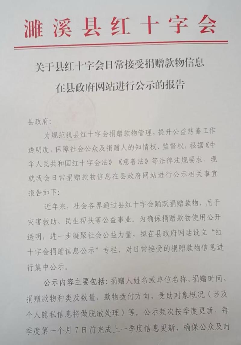 关于濉溪县红十字会日常接受捐赠物款信息的公示