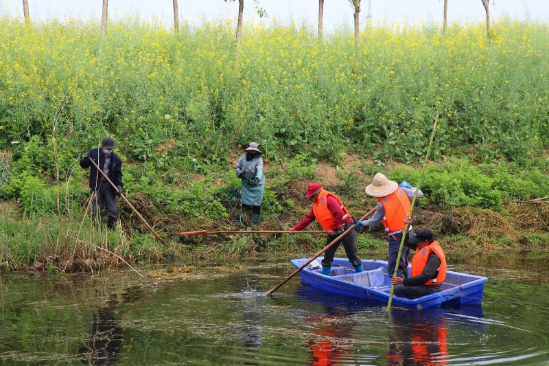 自4月10日起,杨柳沟沿线杨柳村、沟西村、秦口村调配人力70余人、船只4艘、运输车3辆。村民自制绳索、铁钩等实用工具,以每日将近1公里的进度,地毯式、无死角清理水生杂草、岸边杂物和水面漂浮物,提升水域环境质量,以最快速度实现河道、水塘等水域的水面清洁、岸坡整洁、水流畅通,消除视觉污染与安全隐患,恢复并维护水清岸绿的生态景观。