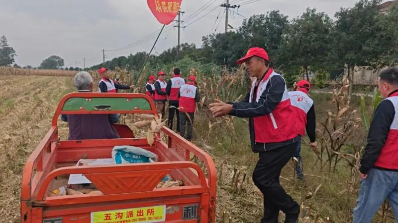 近一个月以来,江淮大地阴雨连绵,秋收无形增加了压力。大型收割机不能进地作业,只能靠人工收割,农民一年的希望在秋天,眼看成熟玉米正是丰收的好时候,但随着恶劣天气加剧面临霉变的风险不断增加。五沟镇退役军人服务站工作人员在走访中了解到孟集村种粮大户退役军人陈俊爱因家中缺少劳动力,其承包的200多亩玉米滞留田间。“灾情就是命令,抢收就是责任!”五沟镇“红耀江淮”退役军人志愿服务队闻令而动,迅速组织队员赶赴田间,他们身着志愿服装、带着农具直奔玉米地,一场与时间赛跑的抢收已悄悄打响。