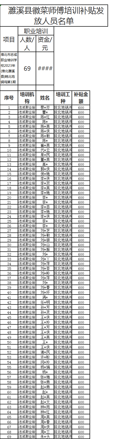 2023年濉溪县徽菜师傅培训补贴发放名单