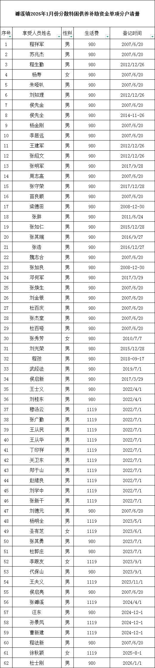 濉溪镇2026年1月份分散特困供养补助资金单项分户清册