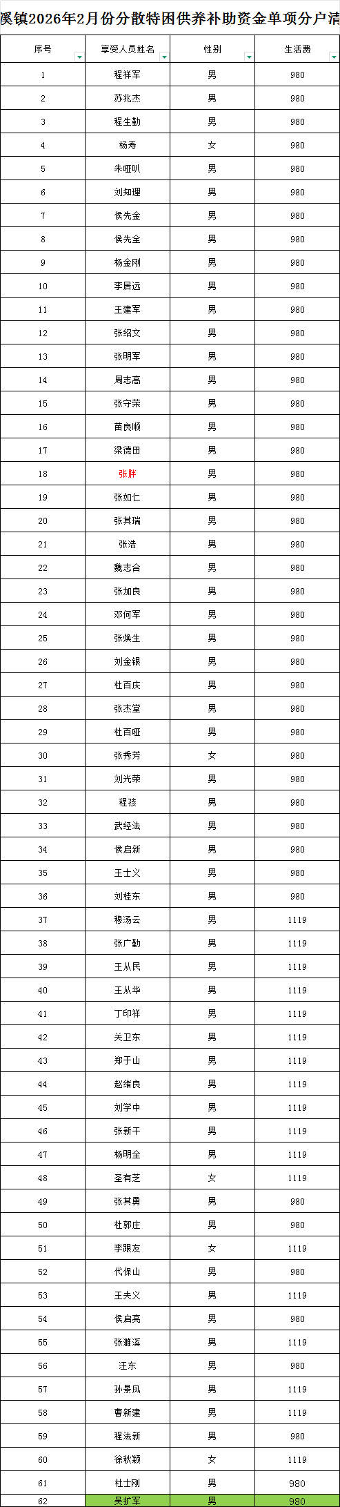 濉溪镇2026年2月份分散特困供养补助资金单项分户清册