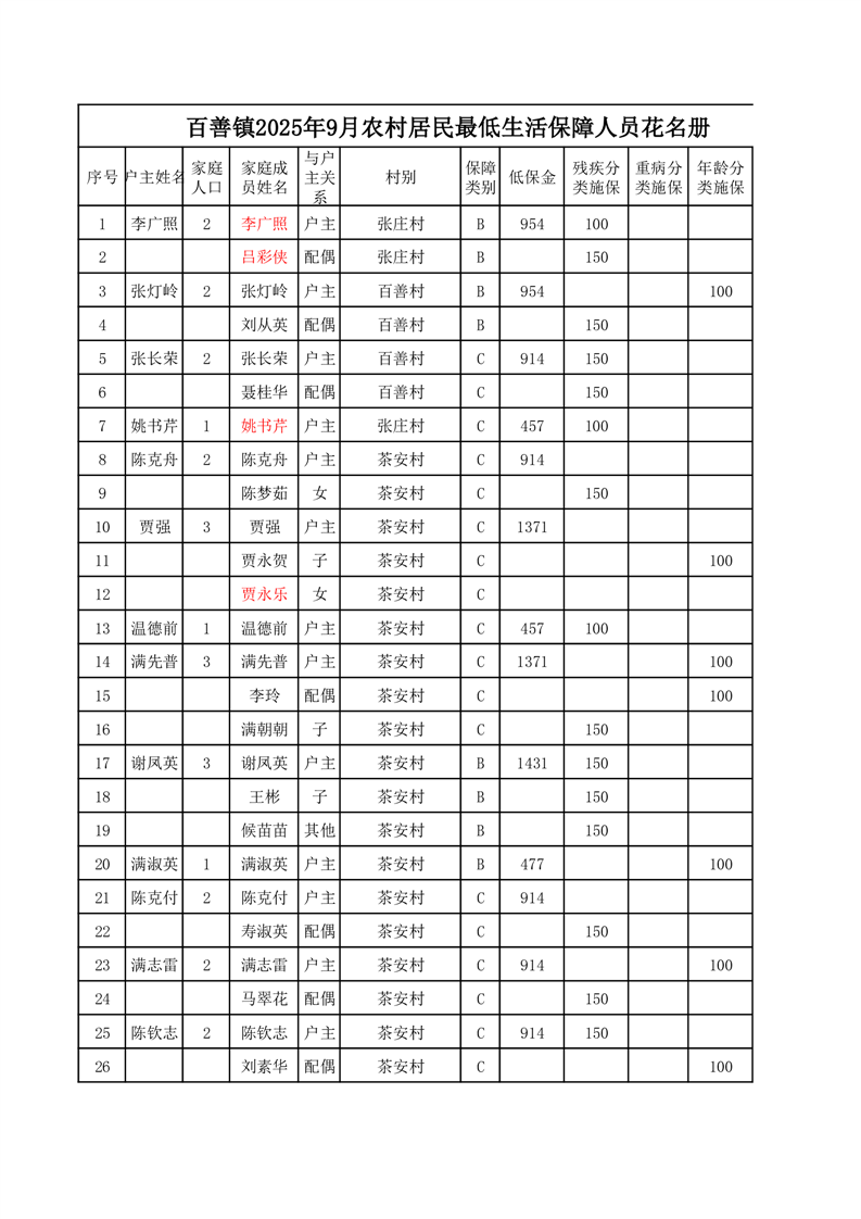 百善镇2025年9月农村居民最低生活保障人员花名册