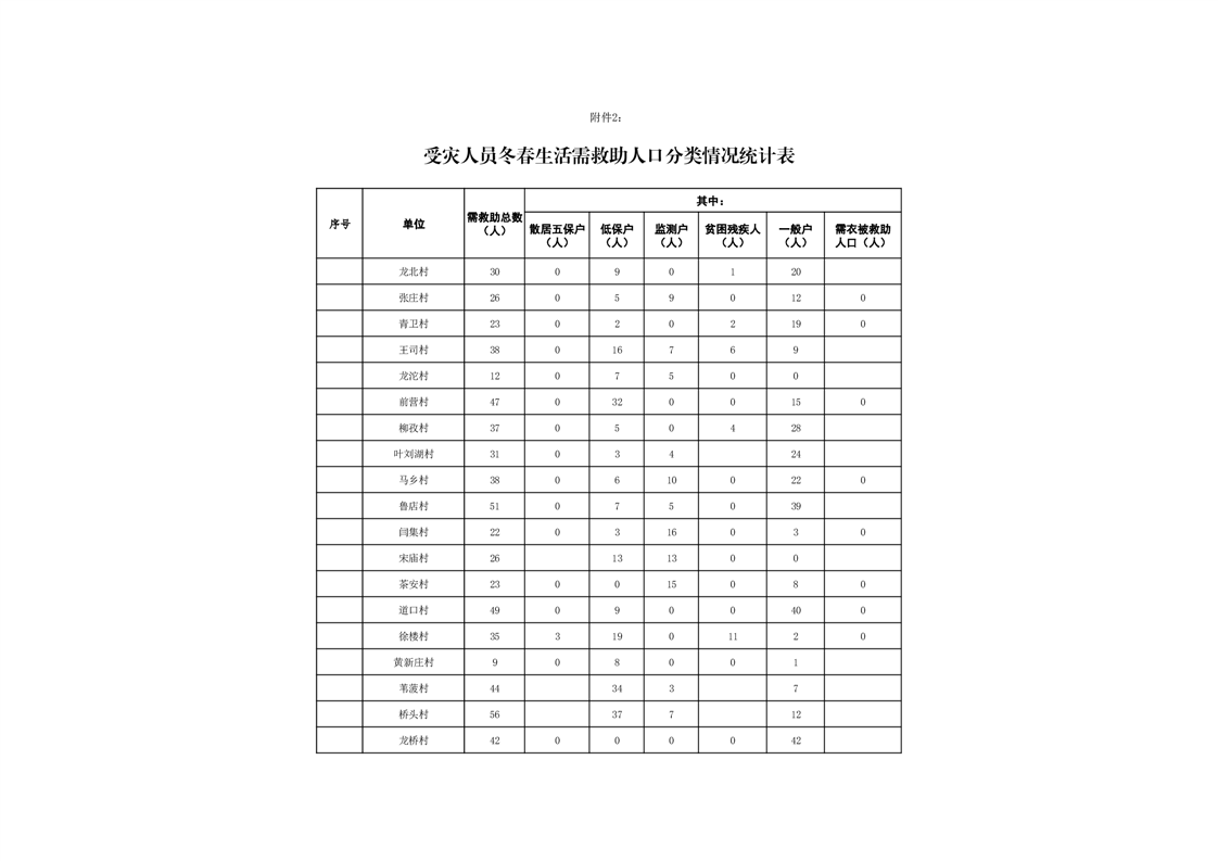 百善镇受灾人员冬春生活需救助人口分类情况统计表