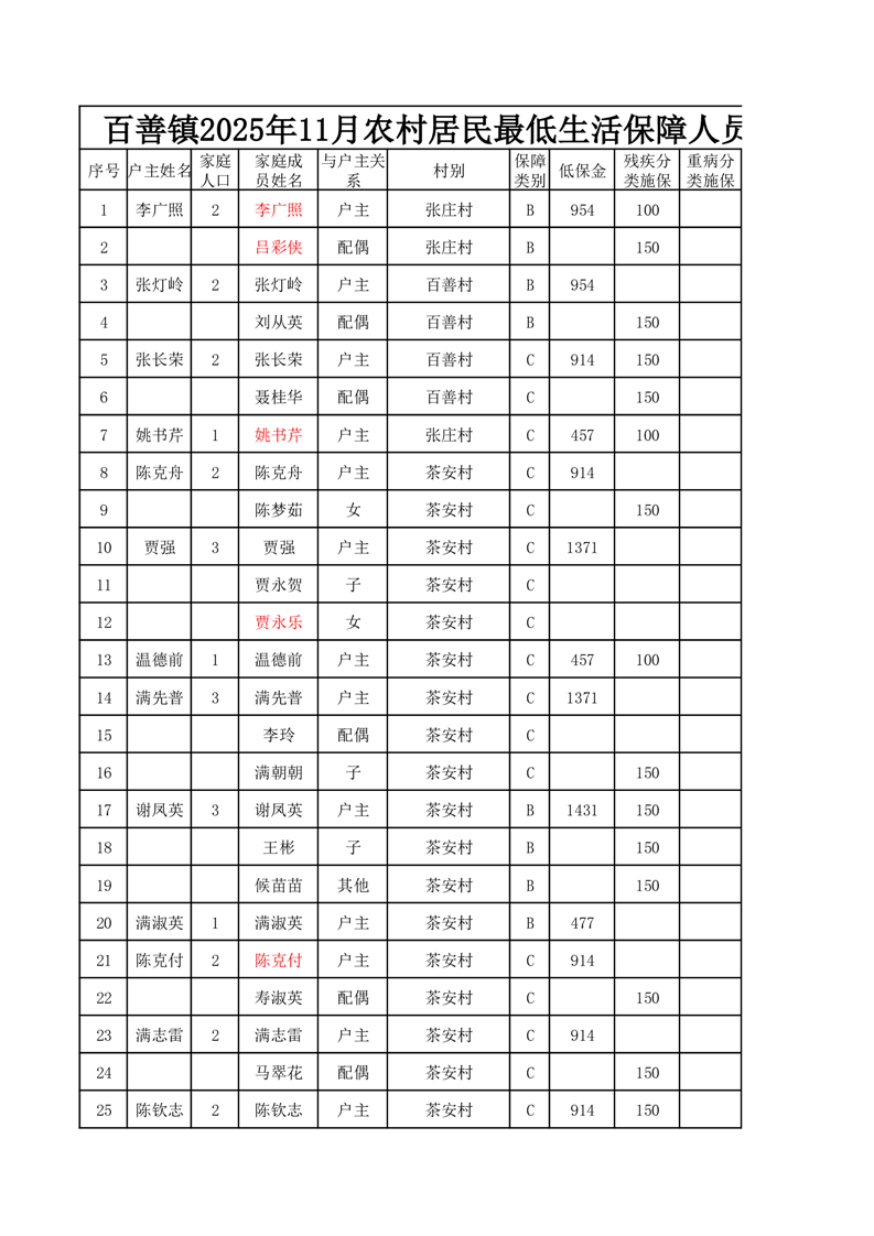 百善镇2025年11月农村居民最低生活保障人员花名册