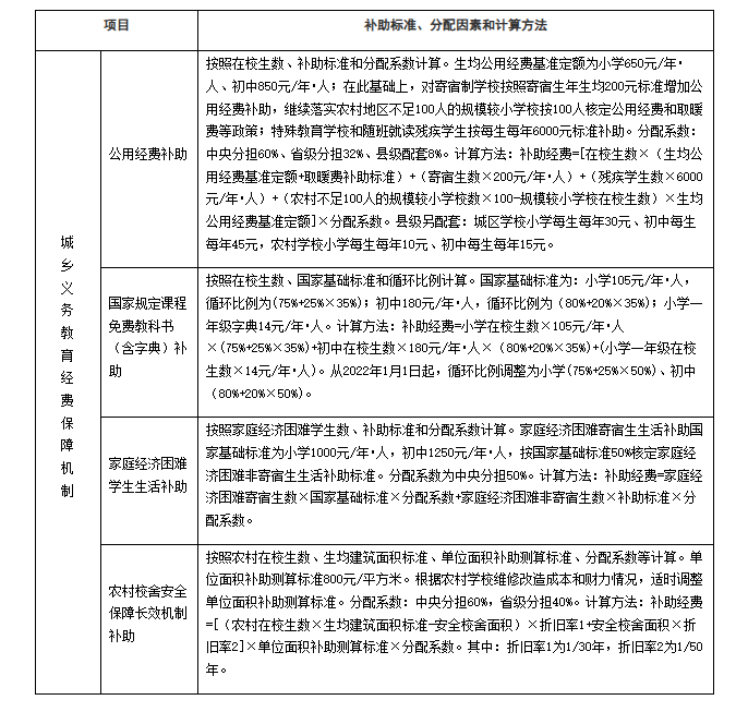 1.对城乡义务教育学生(含民办学校学生)免除学杂费、免费提供教科书、对家庭经济困难学生补助生活费。民办学校学生由学校按照获得的生均公用经费补助免除学杂费。免费提供国家规定课程教科书和免费为小学一年级新生提供正版学生字典的补助标准由国家统一制定,所需资金由中央财政全额承担。家庭经济困难学生生活补助资金由中央与县按规定比例分担,其中家庭经济困难寄宿生生活补助国家基础标准由国家统一制定,并按国家基础标准的一定比例核定家庭经济困难非寄宿生生活补助标准。