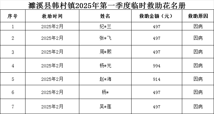 濉溪县韩村镇2025年第一季度临时救助花名册