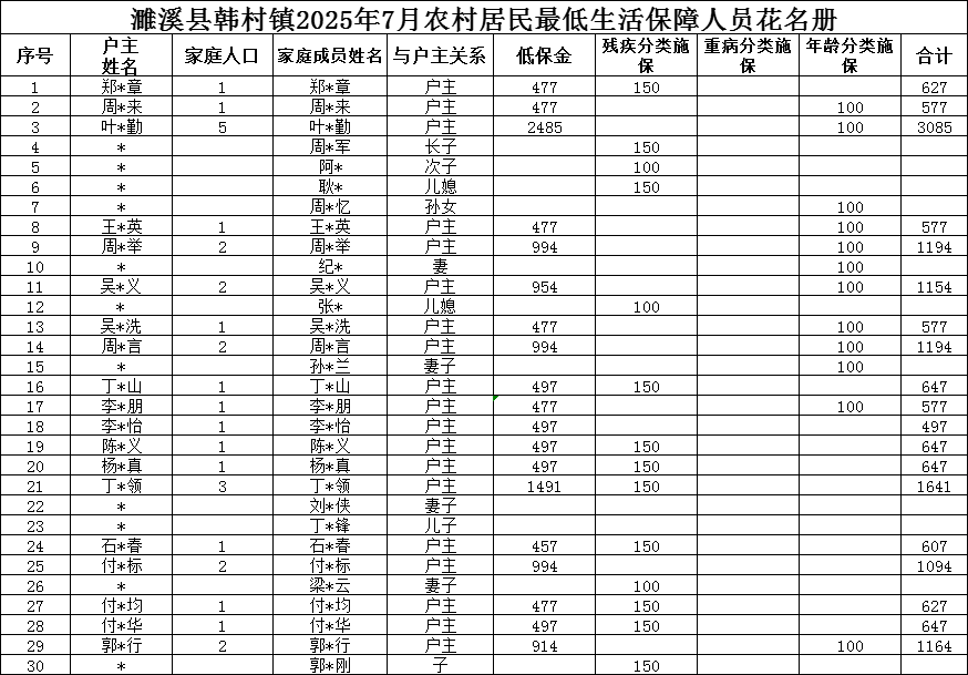 濉溪县韩村镇2025年7月农村居民最低生活保障人员花名册