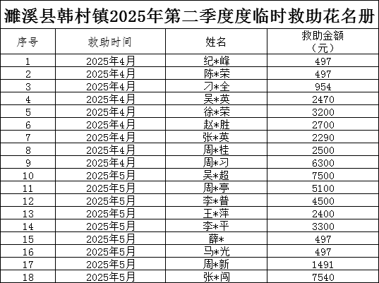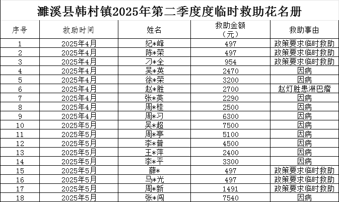 濉溪县韩村镇2025年第二季度临时救助花名册
