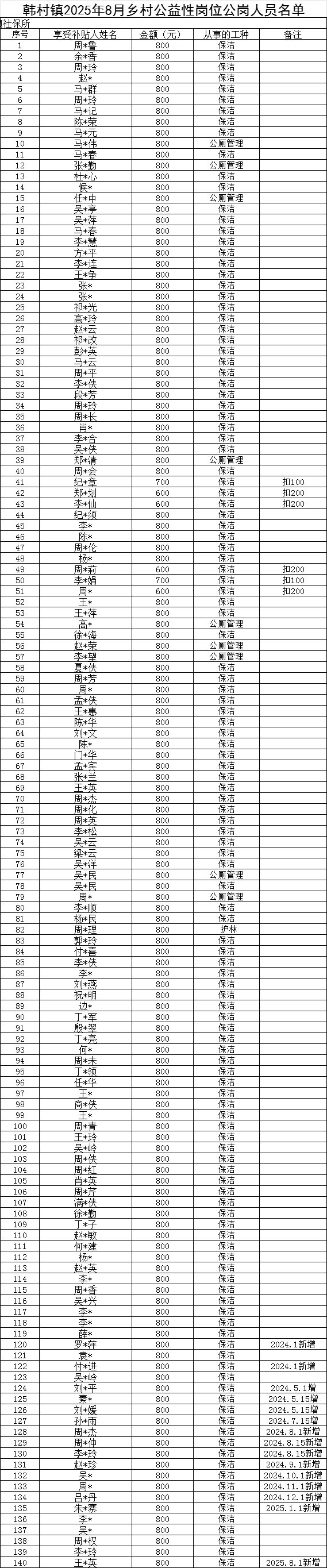濉溪县韩村镇2025年8月乡村公益性岗位公岗人员名单(16-59岁)