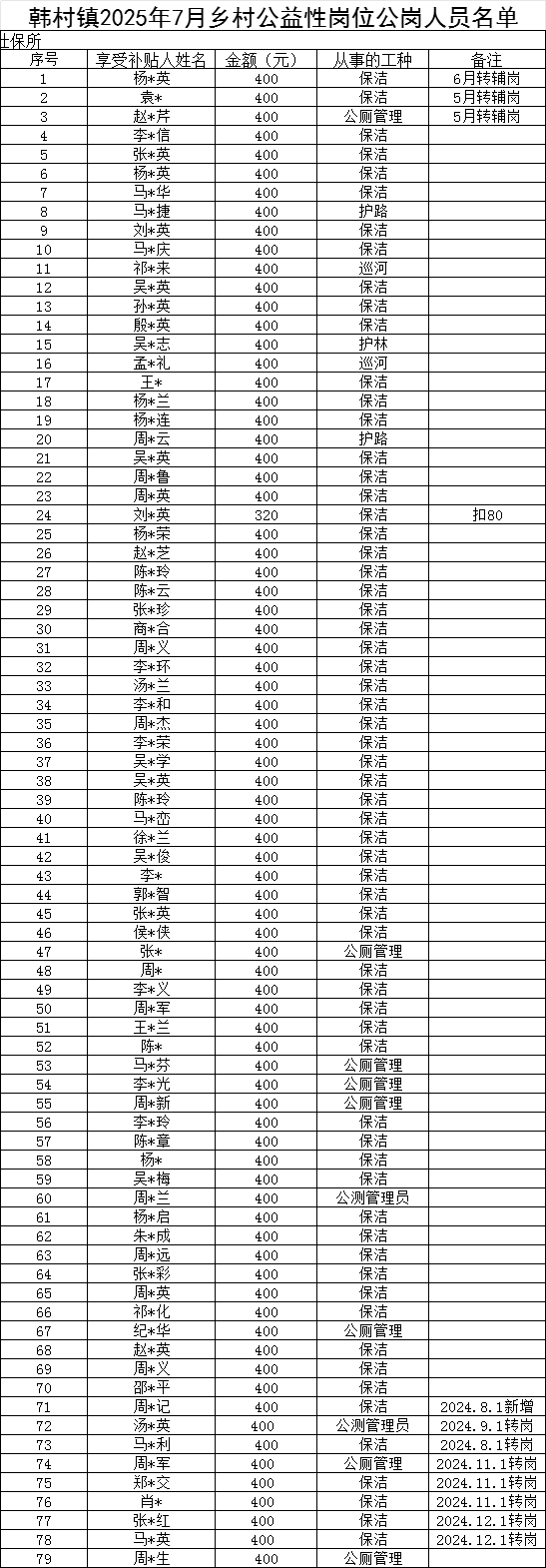 濉溪县韩村镇2025年7月乡村公益性岗位公岗人员名单(60岁以上)