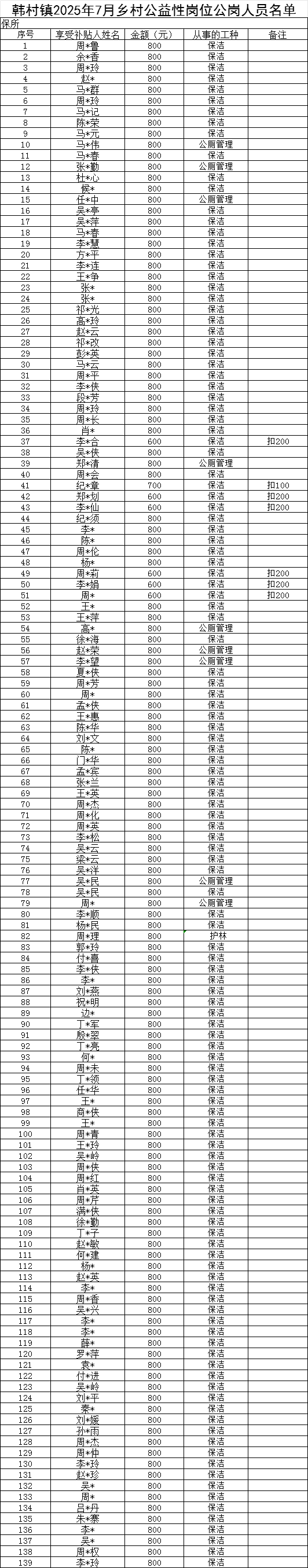 濉溪县韩村镇2025年7月乡村公益性岗位公岗人员名单(16-59岁)