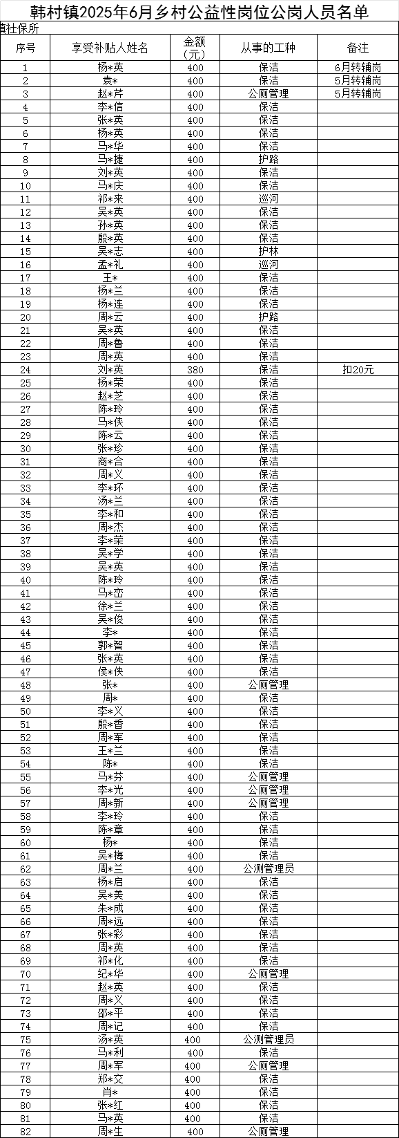 濉溪县韩村镇2025年6月乡村公益性岗位公岗人员名单(60岁以上)