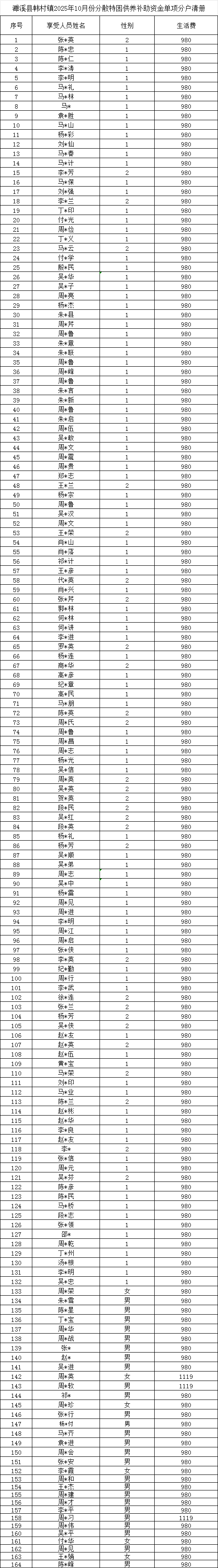 濉溪县韩村镇2025年10月份分散特困供养补助资金单项分户清册