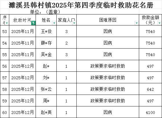 濉溪县韩村镇2025年第四季度临时救助花名册