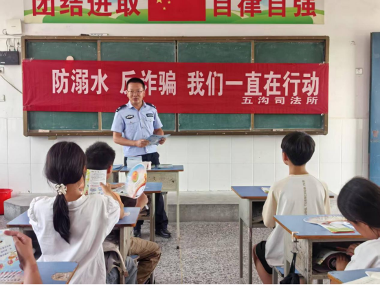 为增强青少年安全防范意识,护航未成年人健康成长。近日,五沟司法所走进曹坊村海孜小学,开展了一场内容丰富、形式多样的民法典、防溺水、反诈骗宣传活动,为全校师生送上了一堂生动实用的“安全法治课”。