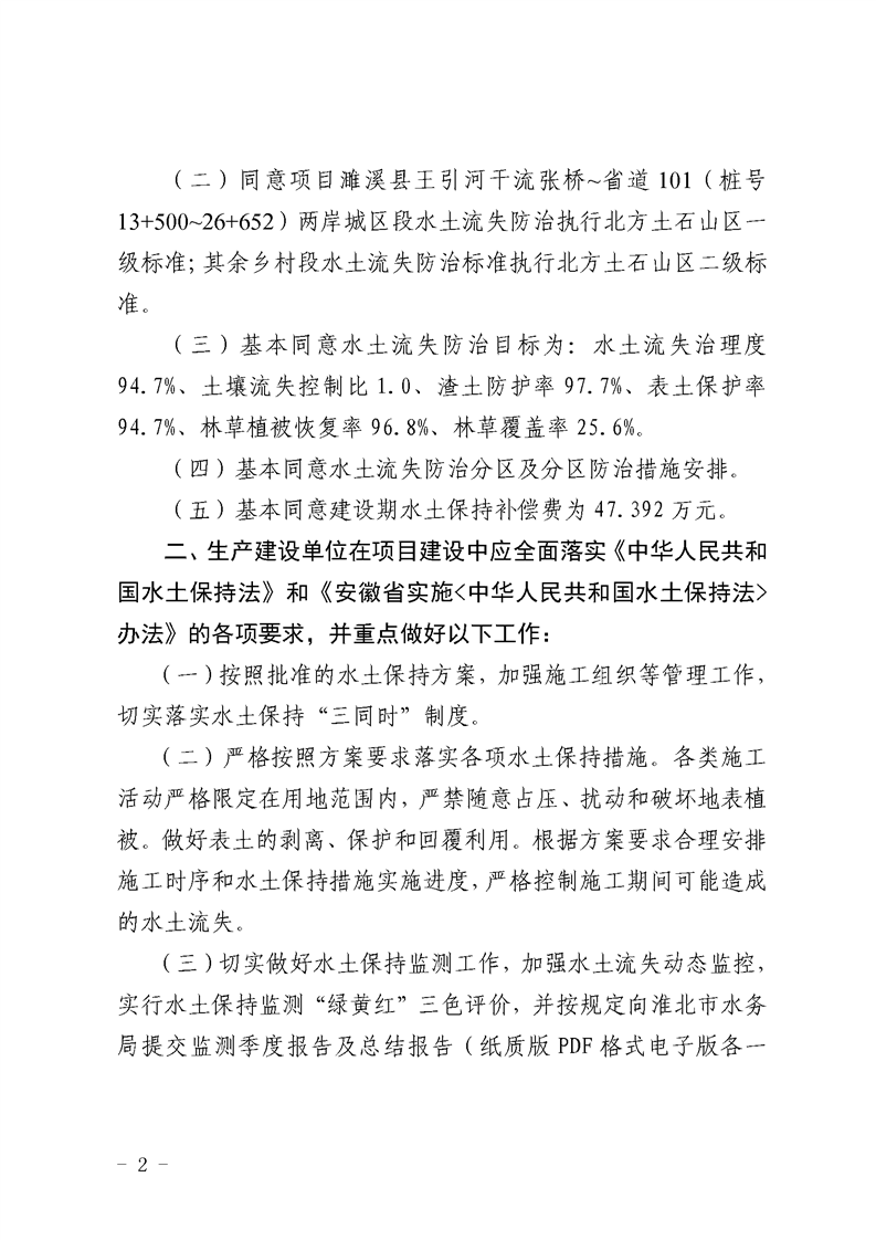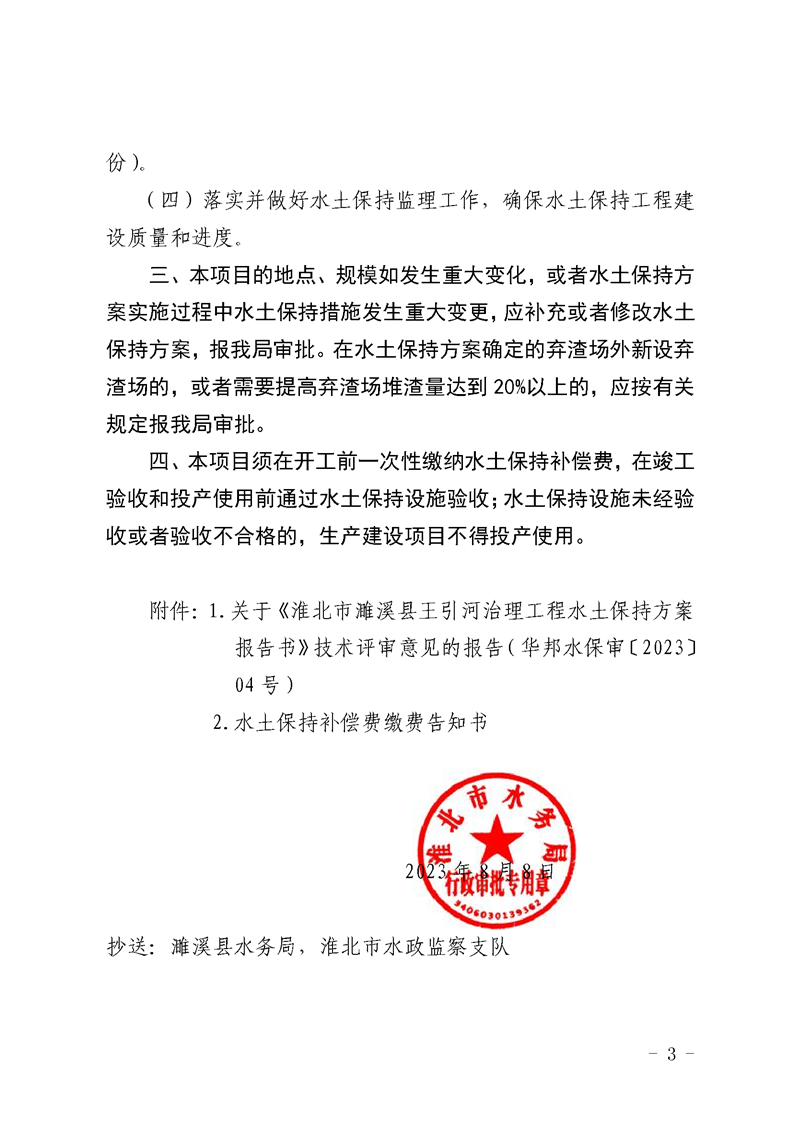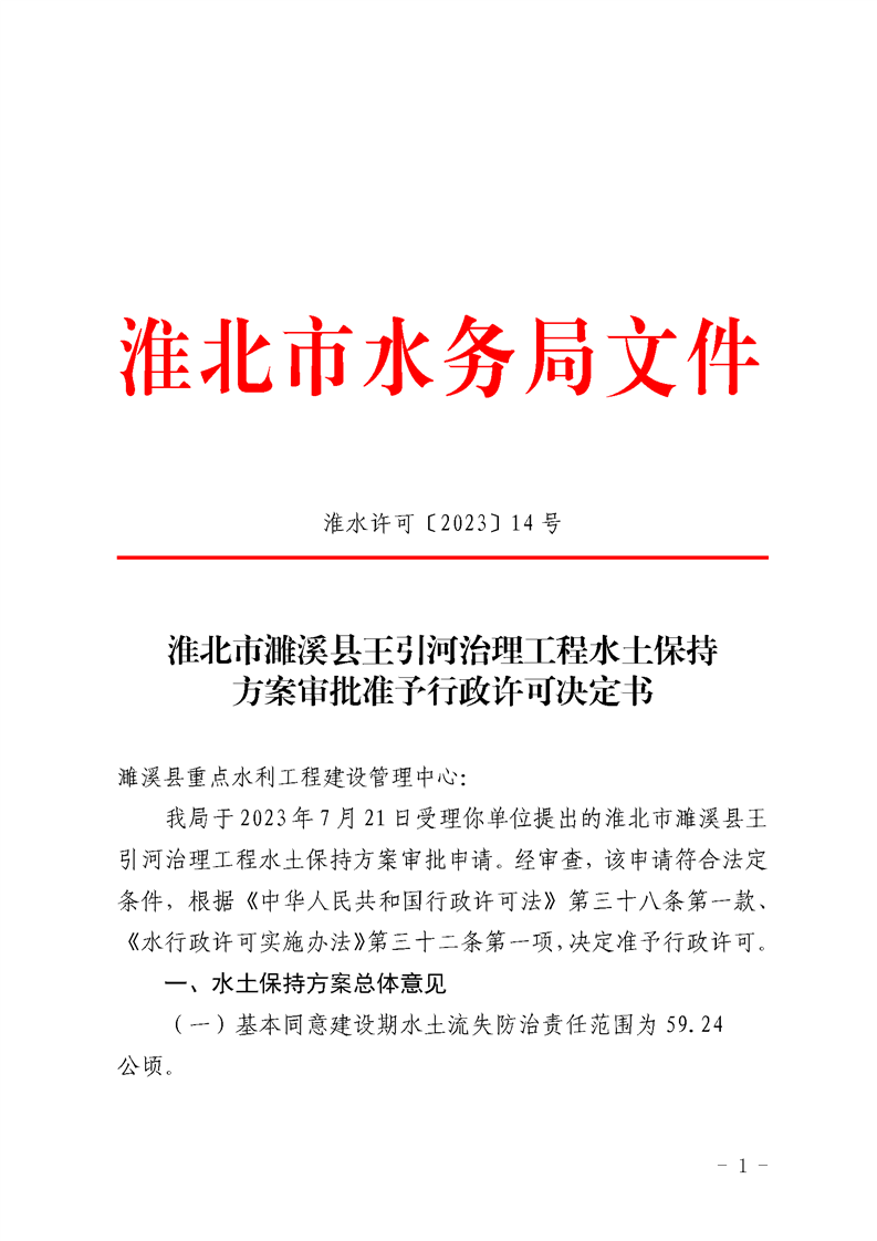 淮北市濉溪县王引河治理工程水土保持方案审批准予行政许可决定书