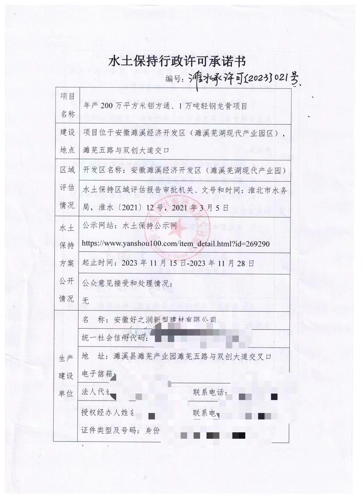 安徽好之润新型建材有限公司轻钢龙骨项目水土保持行政许可承诺书