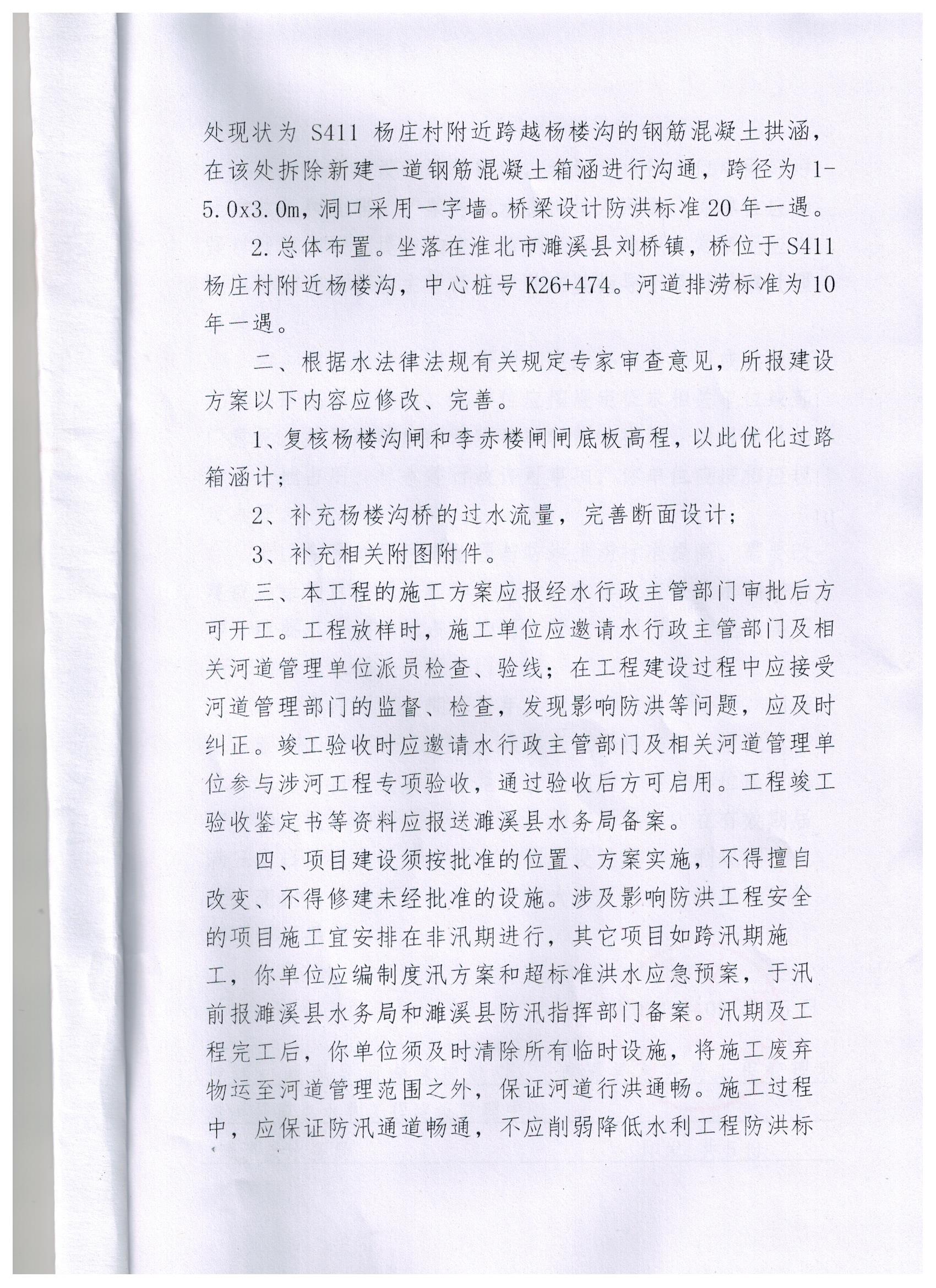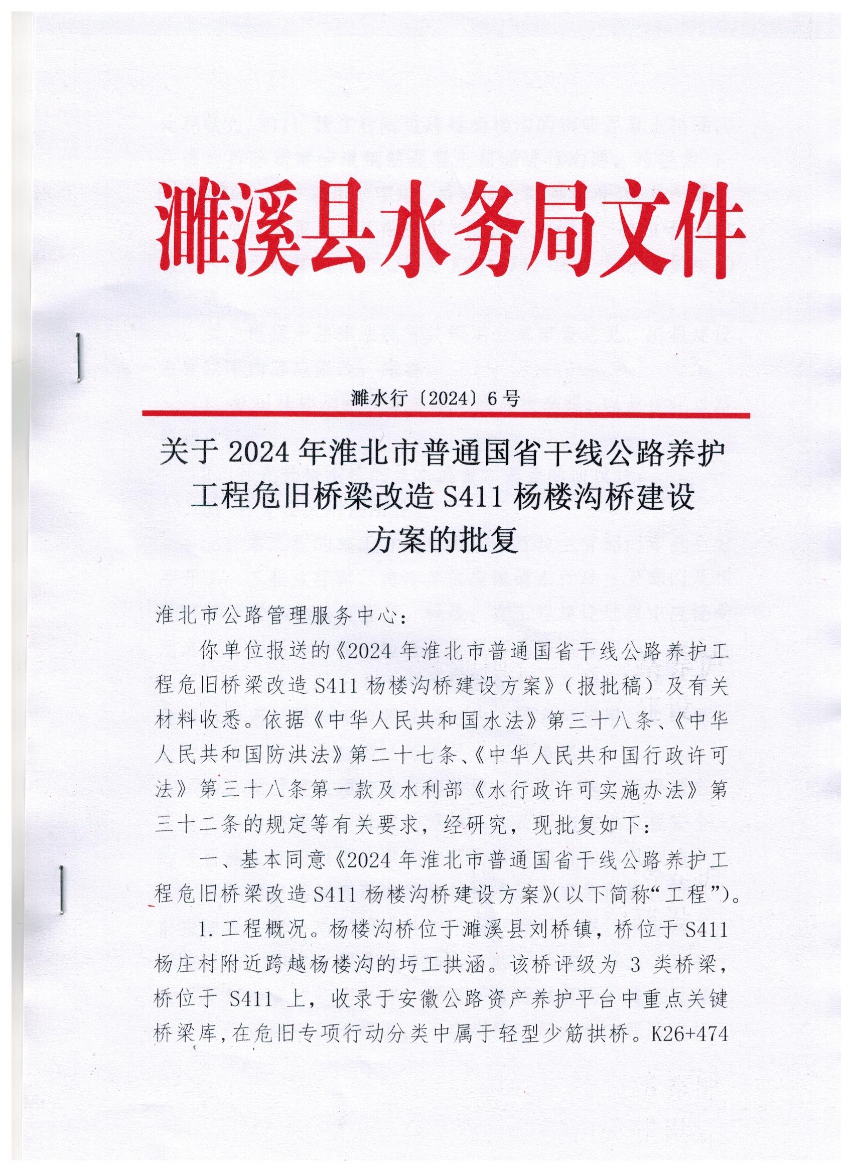 关于2024年淮北市普通国省于线公路养护工程危旧桥梁改造S411杨楼沟桥建设方案的批复