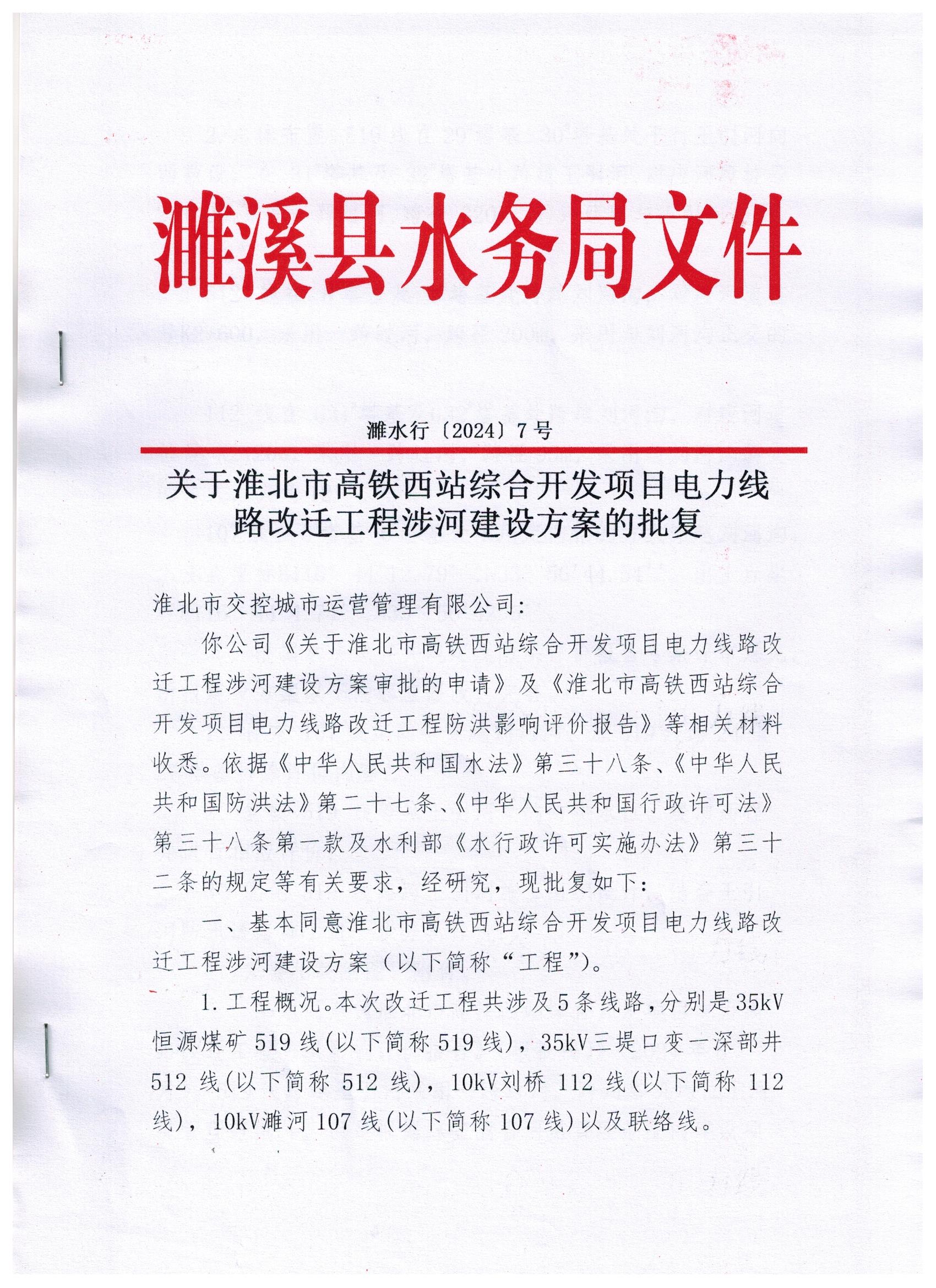 关于淮北市高铁西站综合开发项目电力线路改迁工程涉河建设方案的批复