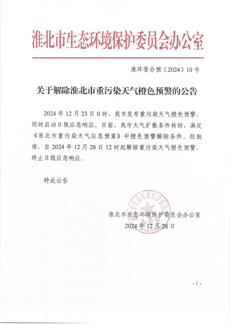 淮环委办预〔2024〕10号关于解除重污染天气橙色预警的公告