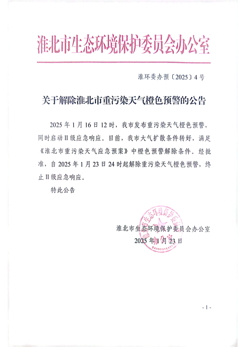 淮环委办预〔2025〕4号关于解除重污染天气橙色预警的公告