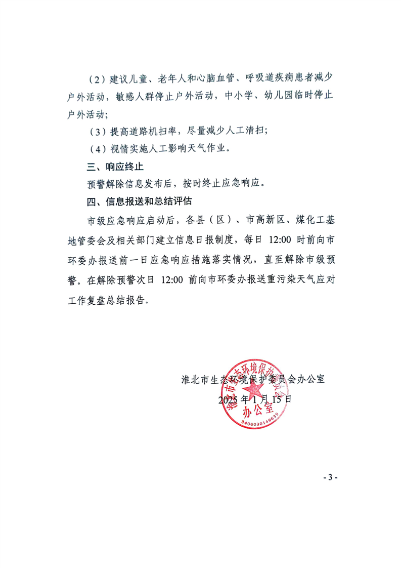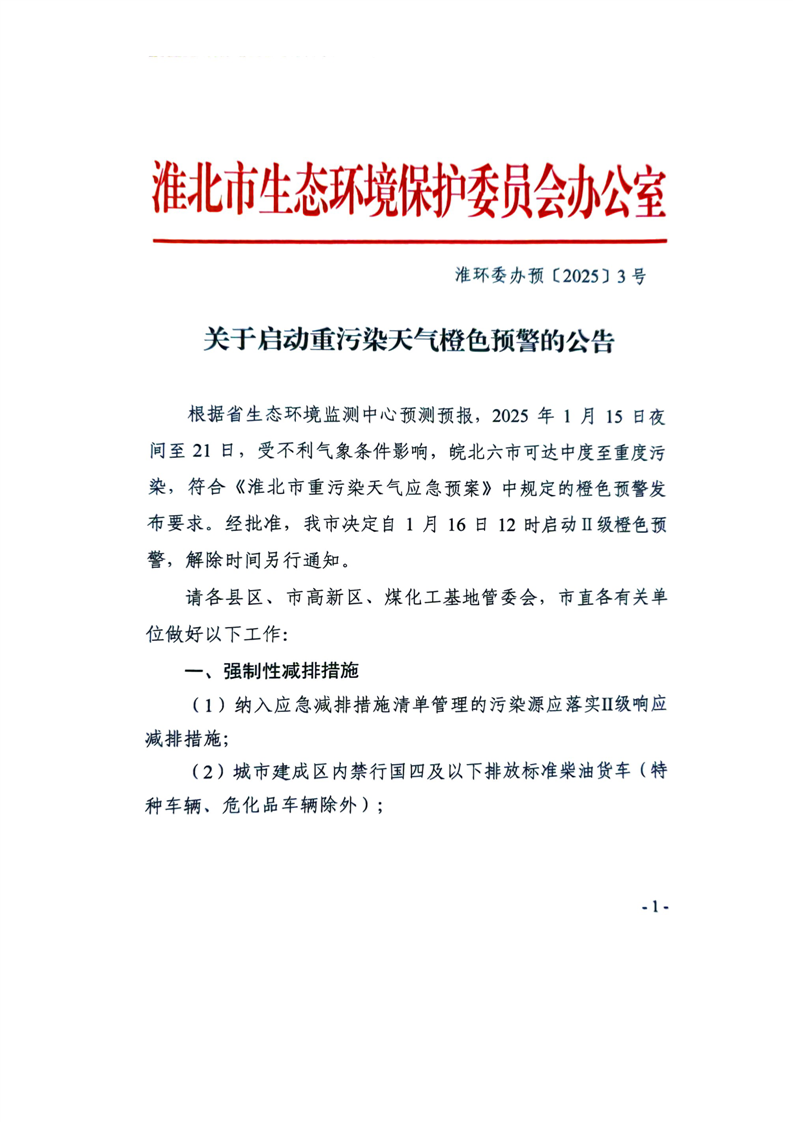 淮环委办预〔2025〕3号关于启动重污染天气橙色预警的公告