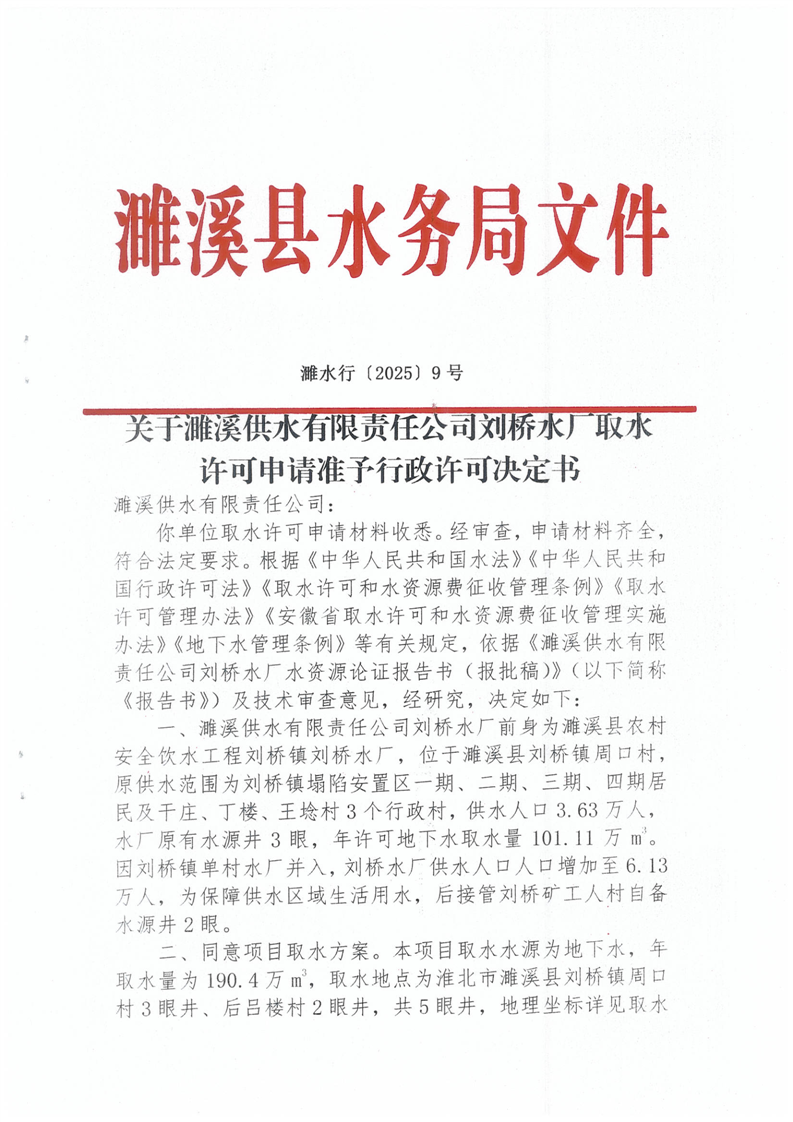 关于濉溪县供水有限责任公司刘桥水厂取水许可申请准予行政许可决定书