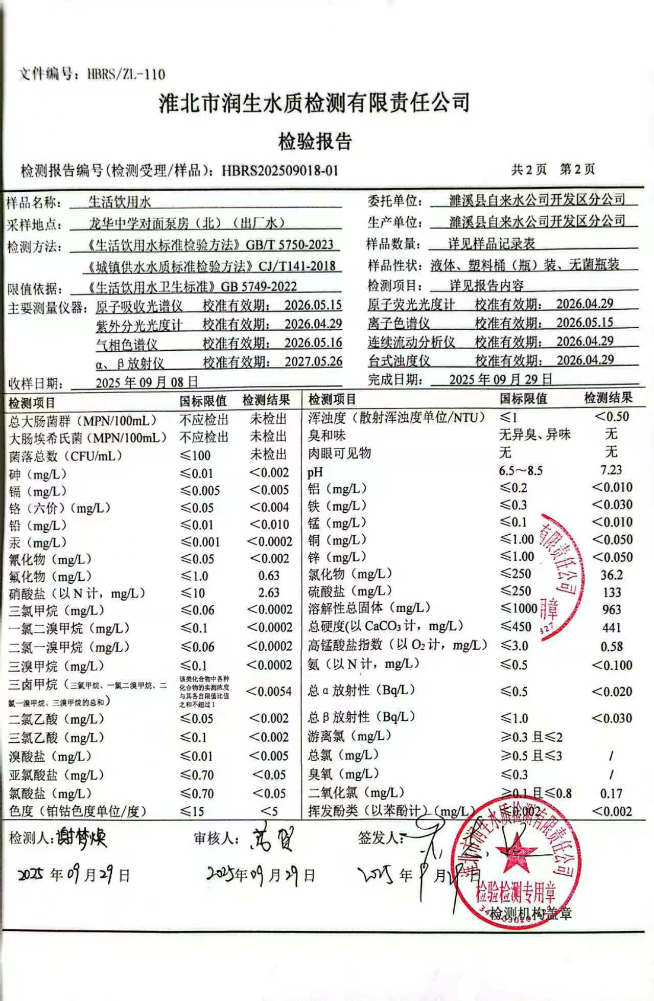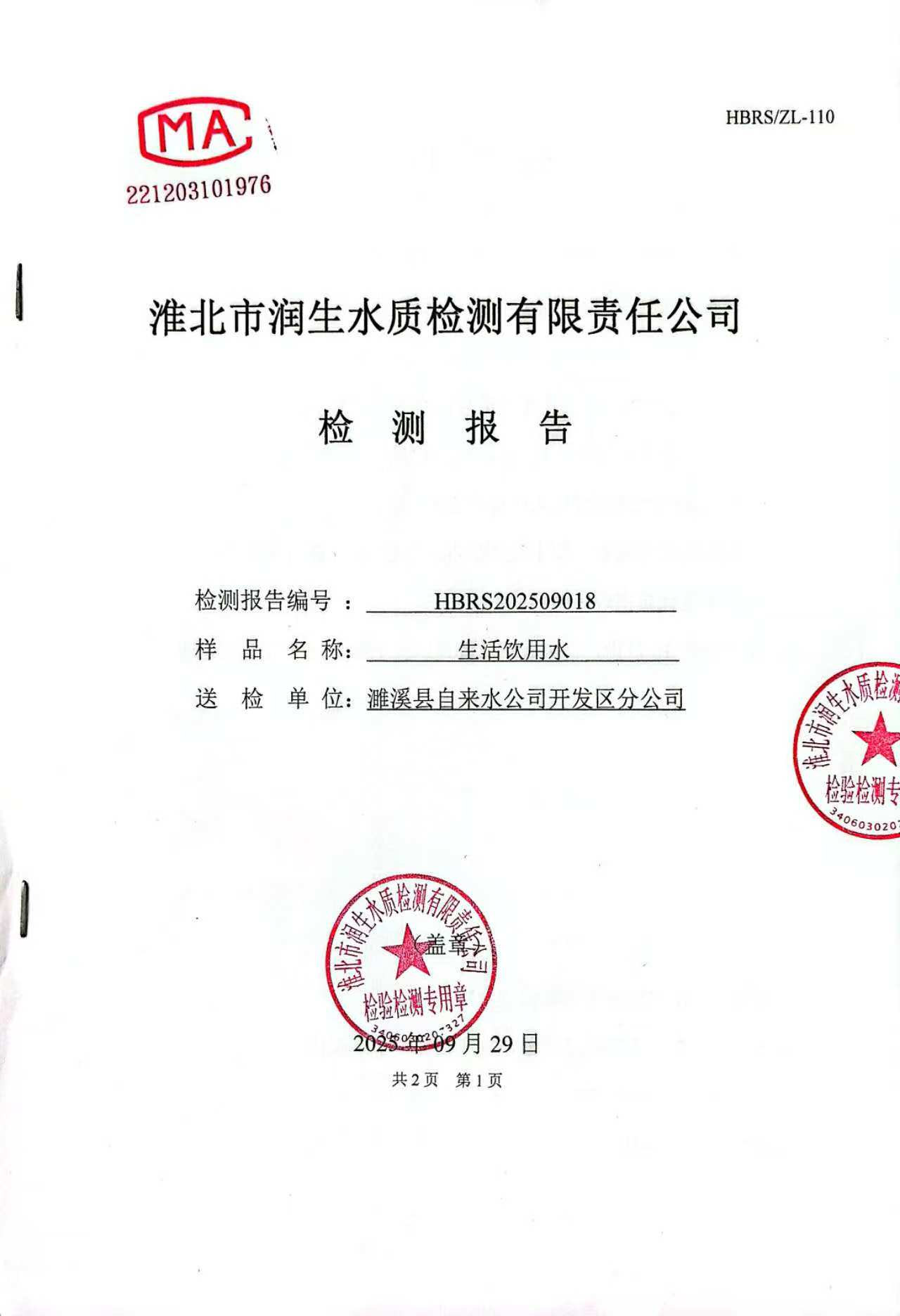 濉溪县自来水公司开发区分公司2025年9月月检水质检测报告(出厂水)