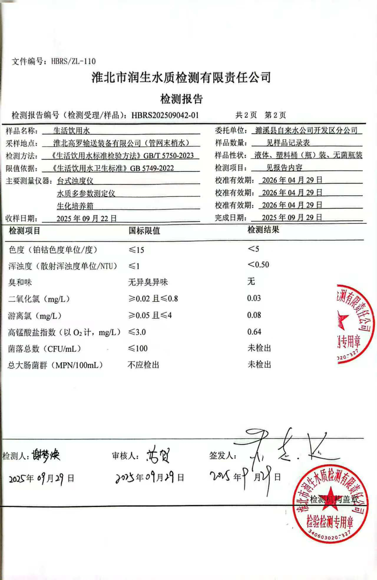 濉溪县自来水公司开发区分公司2025年9月下半月检测报告(管网水)