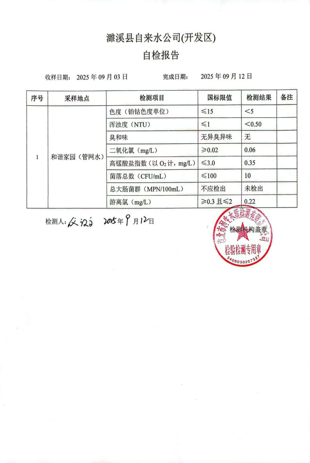 濉溪县自来水公司开发区分公司2025年9月上半月自检报告(管网水)
