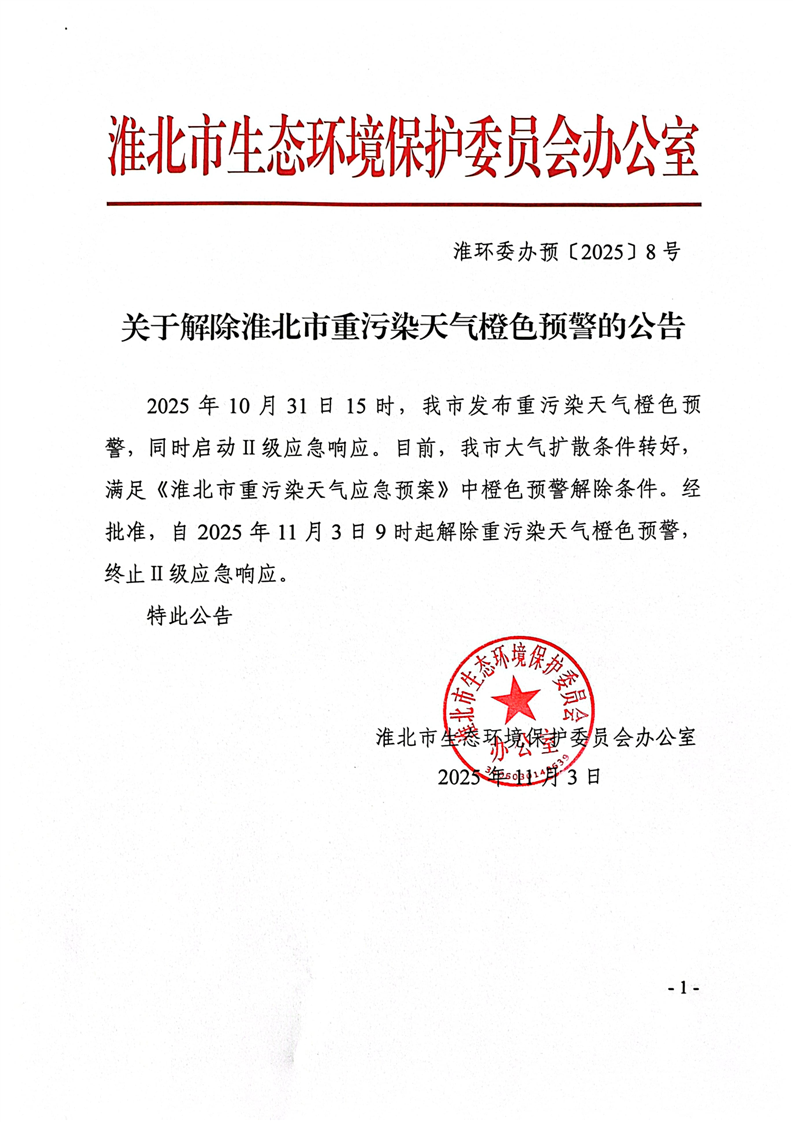 淮环委办预【2025】8号关于解除重污染天气橙色预警的公告