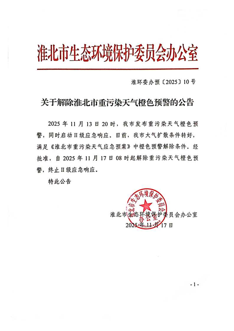 淮环委办预〔2025〕10号关于解除重污染天气橙色预警的公告