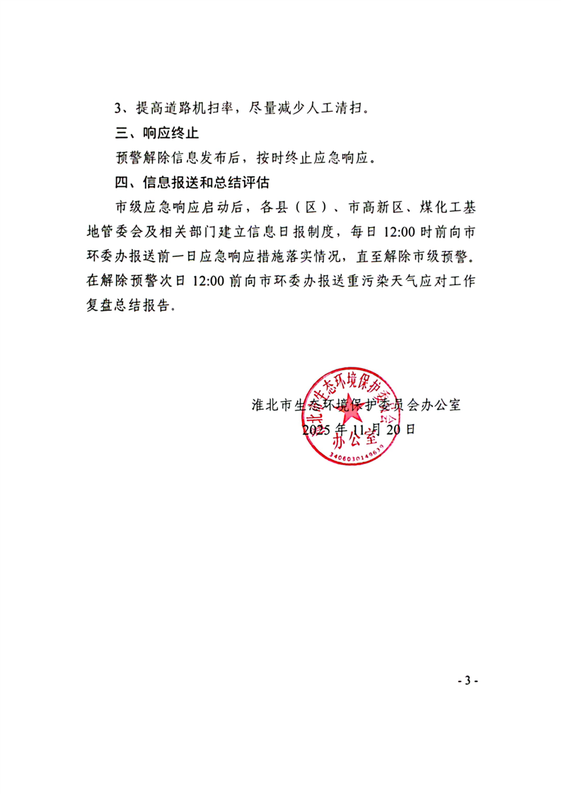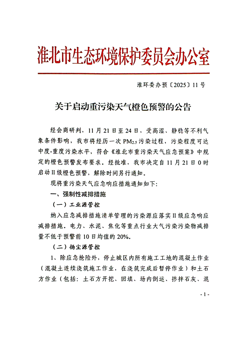 淮环委办预〔2025〕11号关于启动重污染天气橙色预警的公告