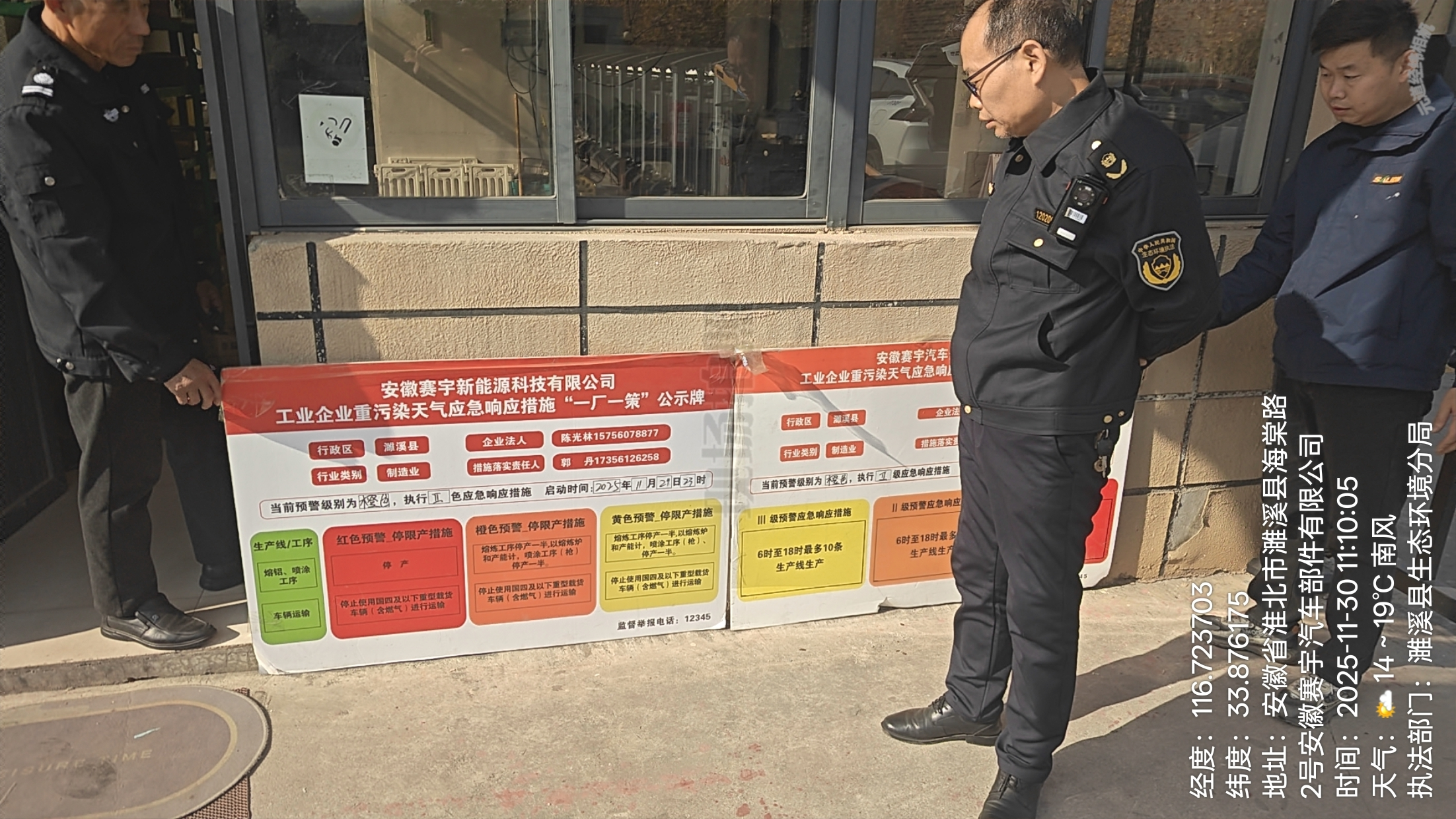 2025年11月30日上午,濉溪县生态环境分局对赛宇汽车部件、开发区危废贮存项目工地应急减排措施落实情况进行现场检查。经查,均已落实预警措施。