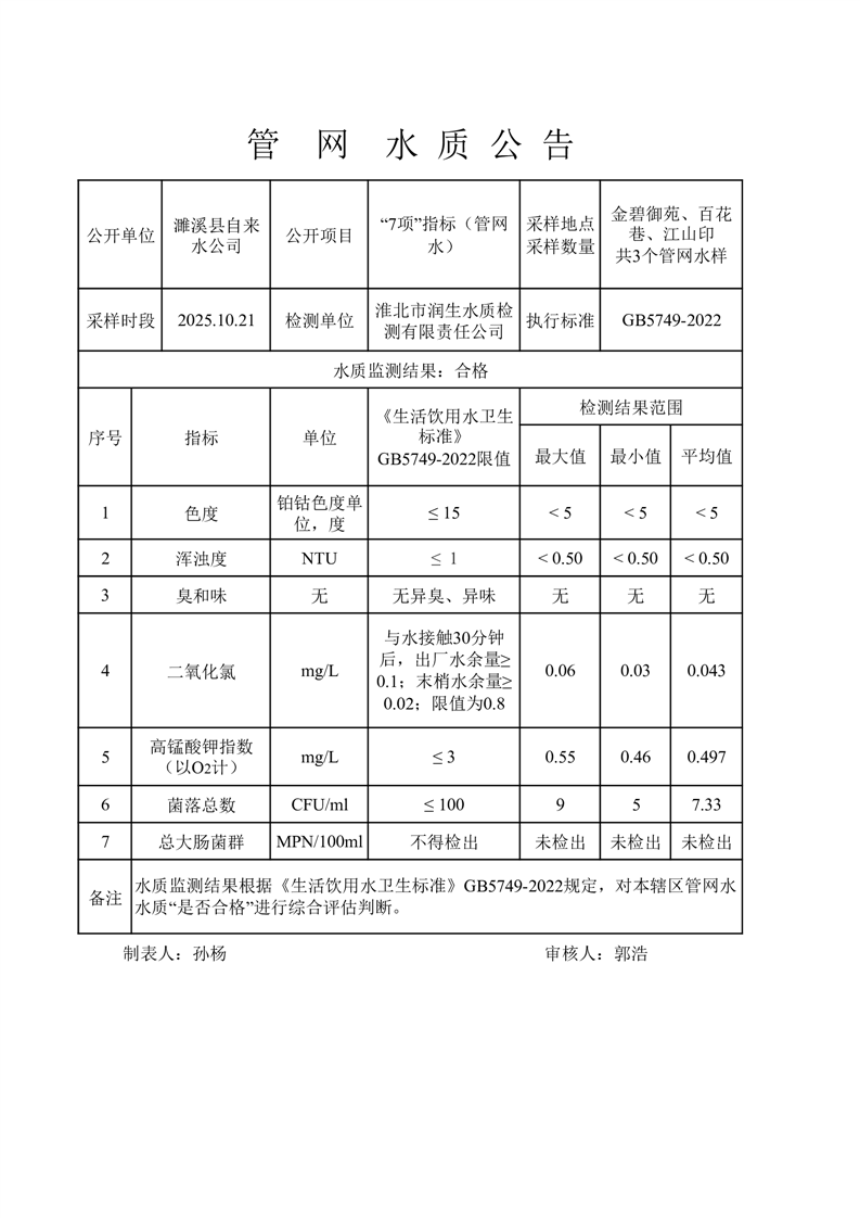 2025年10月下半月“7项”管网水