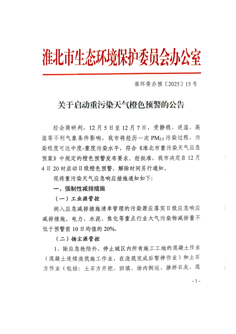 淮环委办预〔2025〕15号关于启动重污染天气橙色预警的公告