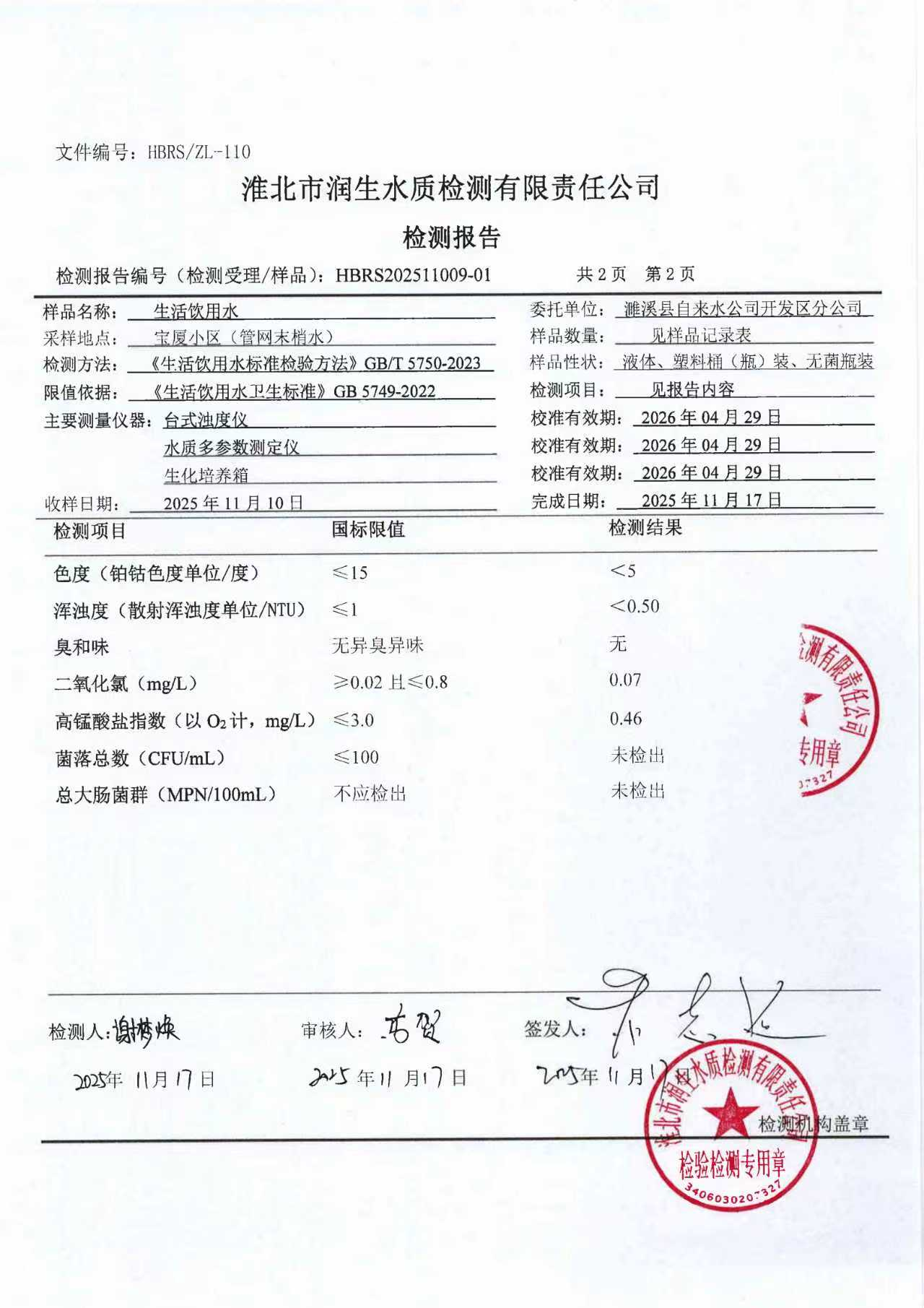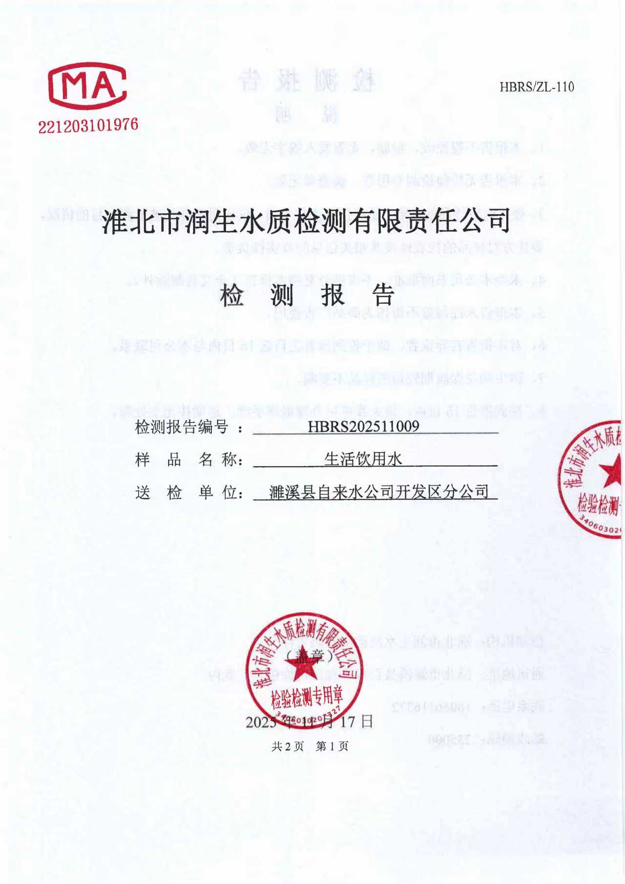 濉溪县自来水公司开发区分公司2025年11月上半月检测报告(管网水)