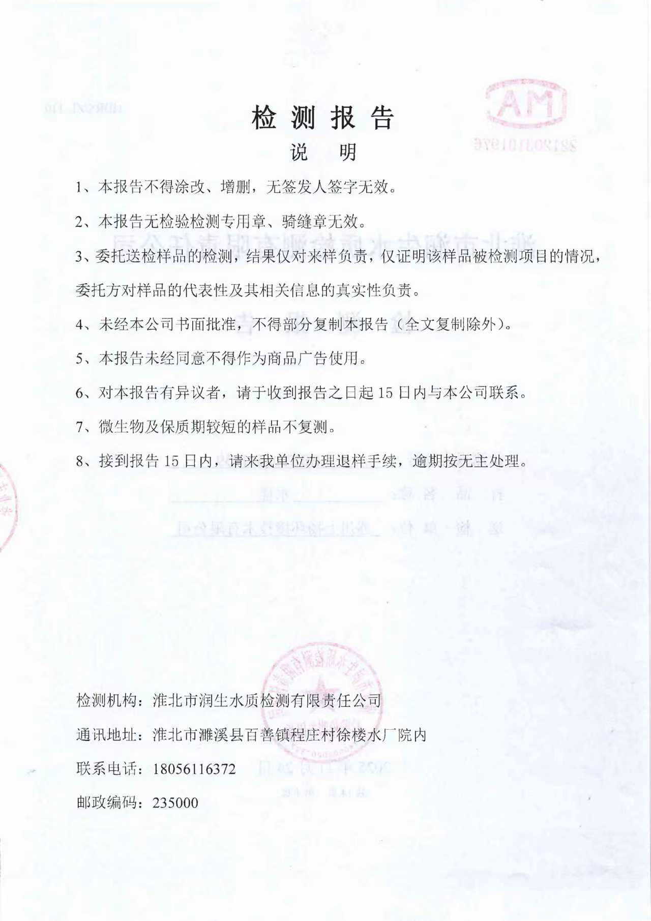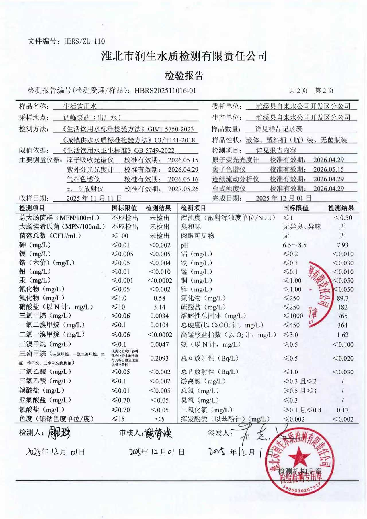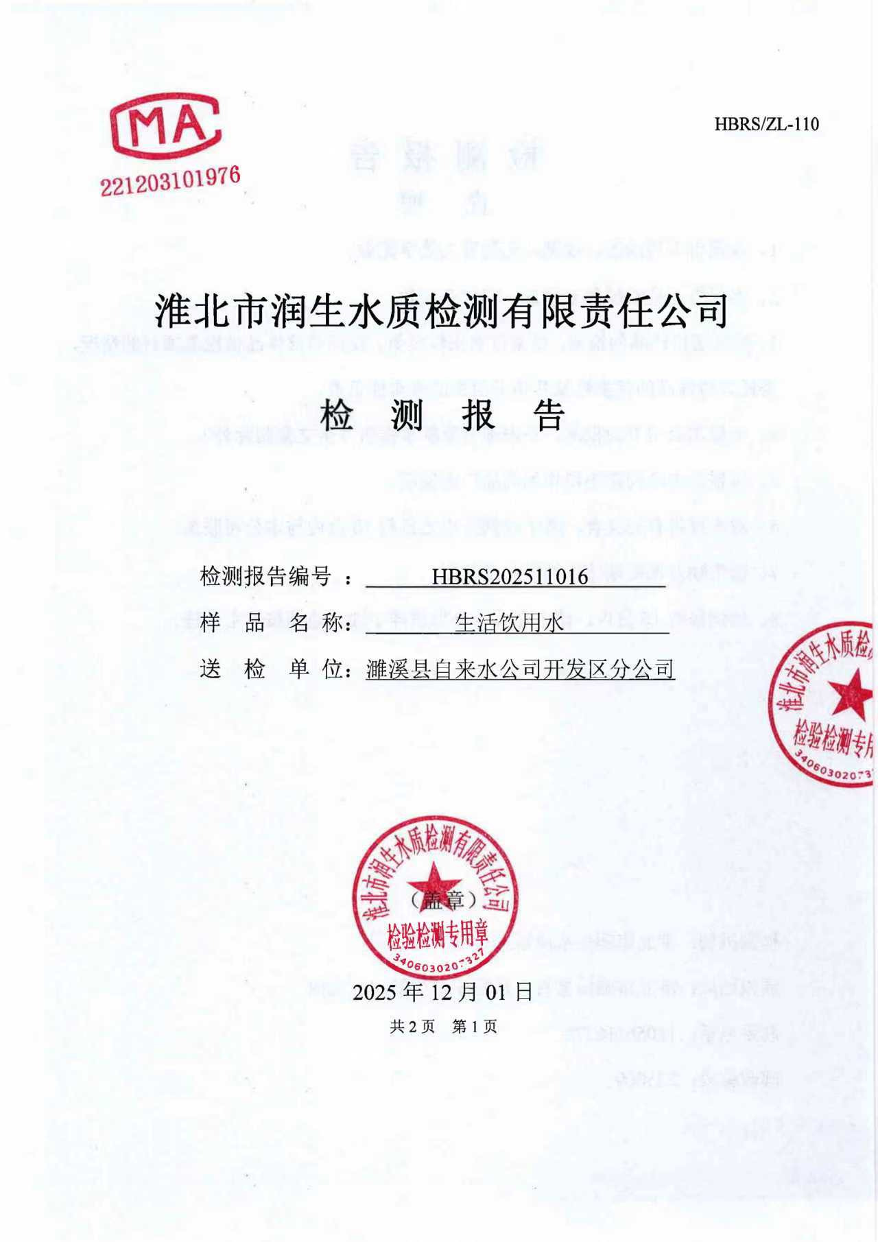 濉溪县自来水公司开发区分公司2025年11月月检水质检测报告(出厂水)