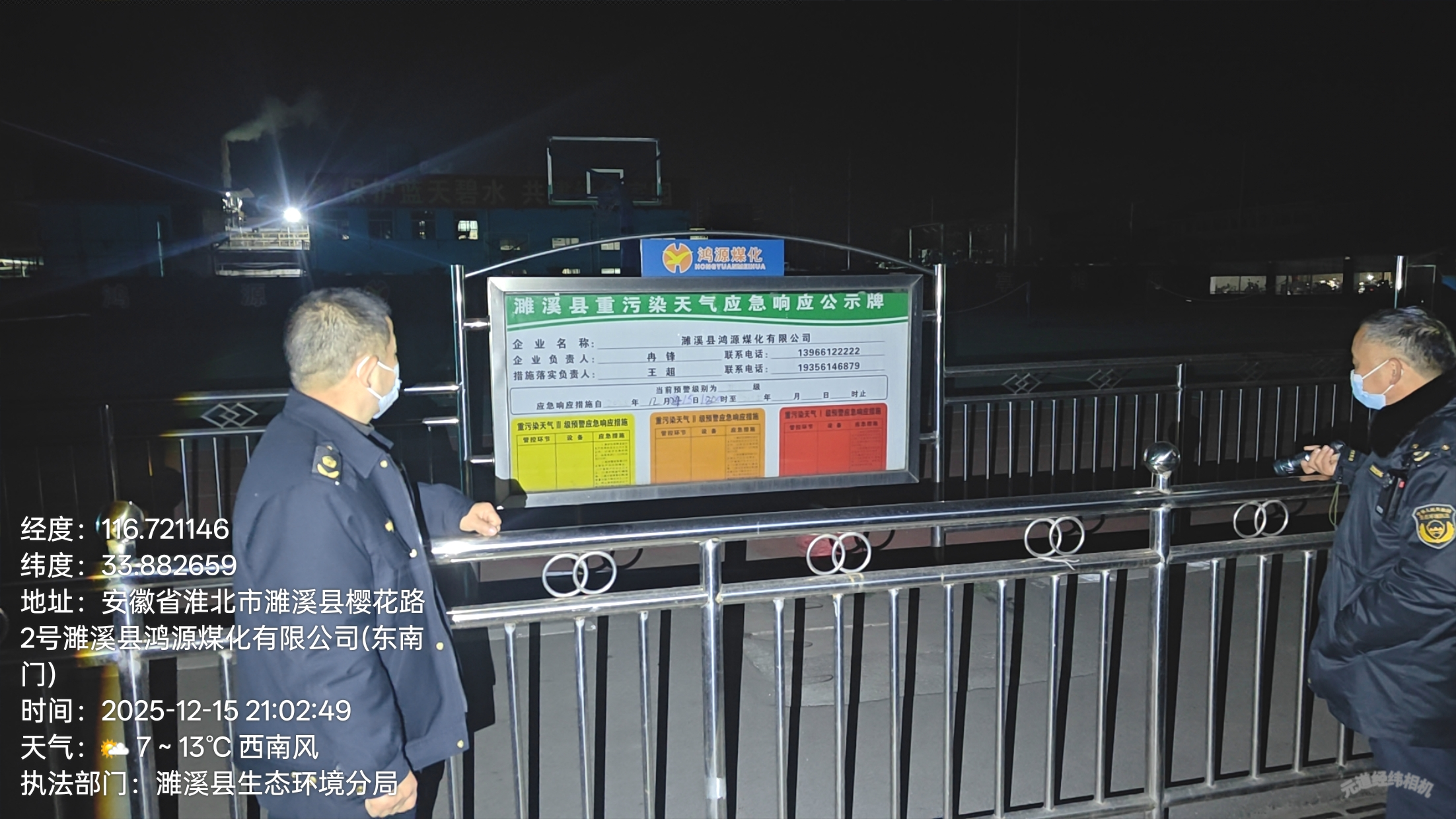 2025年12月15日夜间,濉溪县生态环境分局执法人员,对鸿源煤化、巨成化工、力幕新材料3家涉气企业重污染天气应急减排措施落实及污染防治措施运行情况进行现场检查。经核查,应急减排措施均已落实到位。