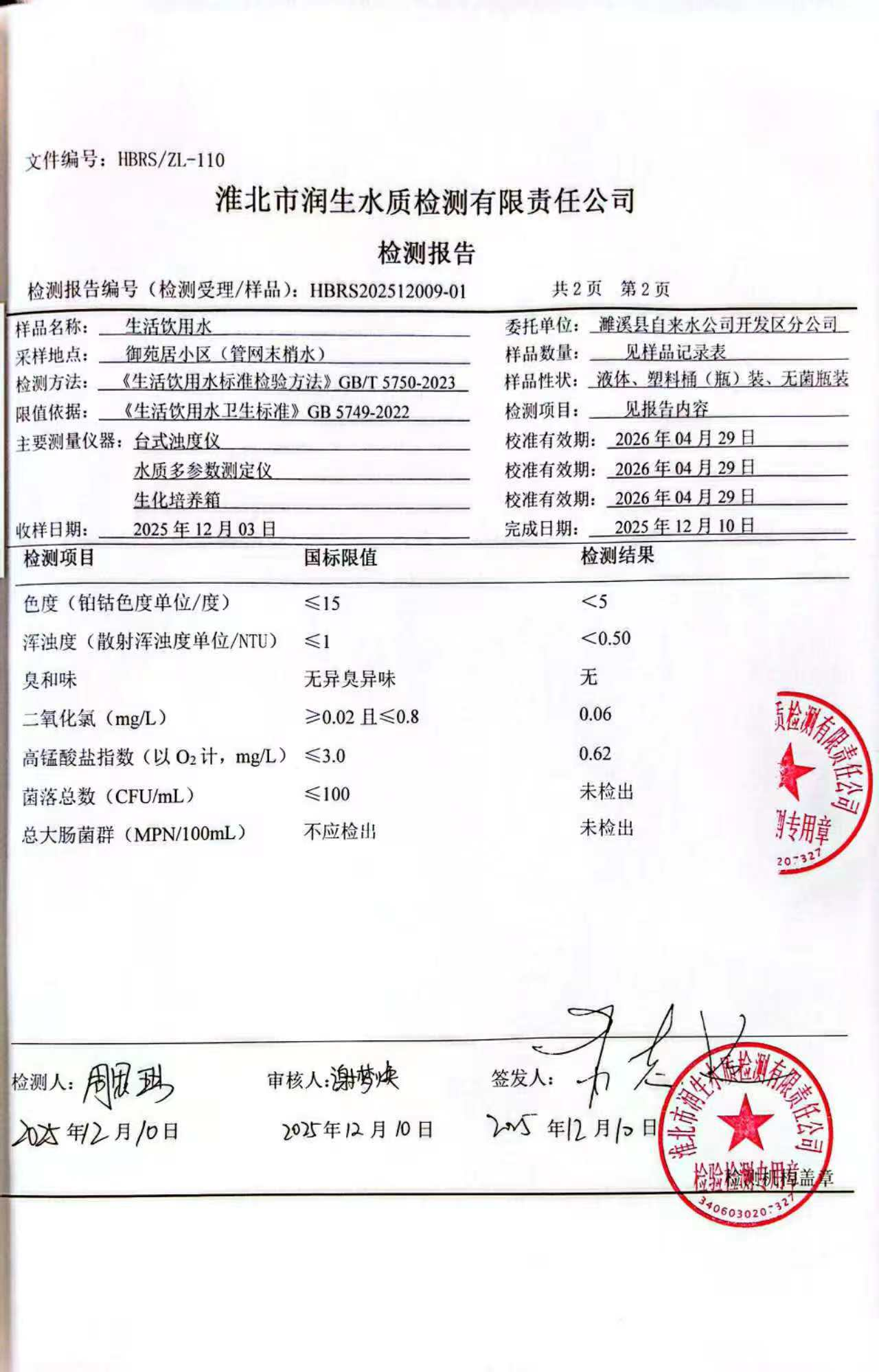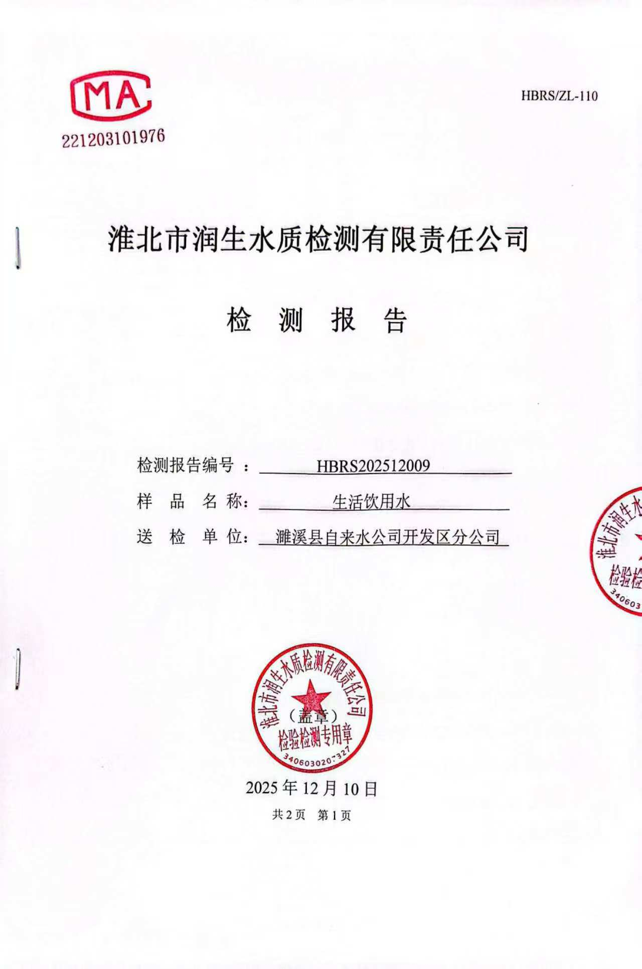 濉溪县自来水公司开发区分公司2025年12月上半月检测报告(管网水)