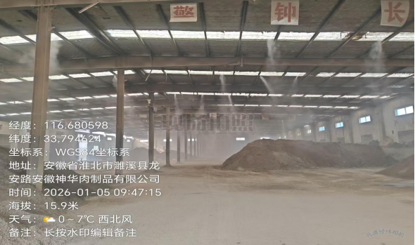 现场检查时,该公司未组织生产,场内建有两座物料大棚,配套建有喷淋设施,上料口已安装喷淋设施, 物料大棚门窗有破损现象,场内已安装车辆进出冲洗装置,车辆清洗水进入零排放自动化系统,循环利用不外排。