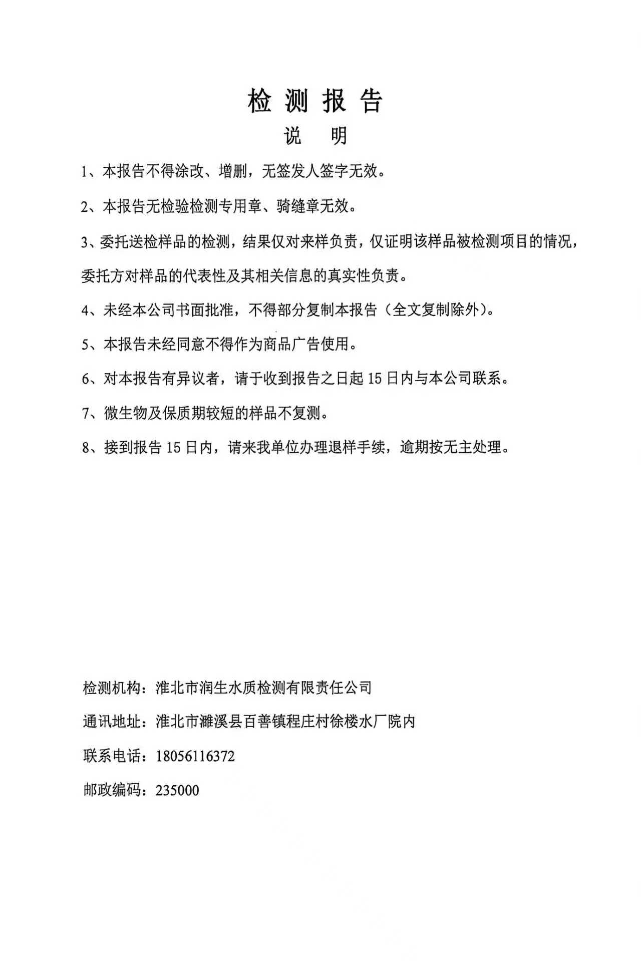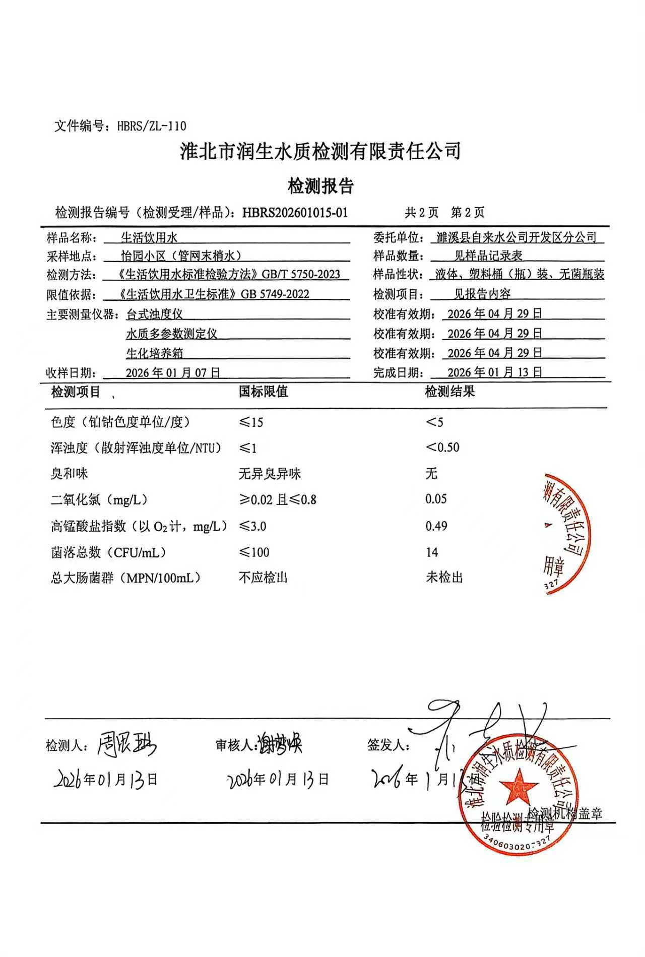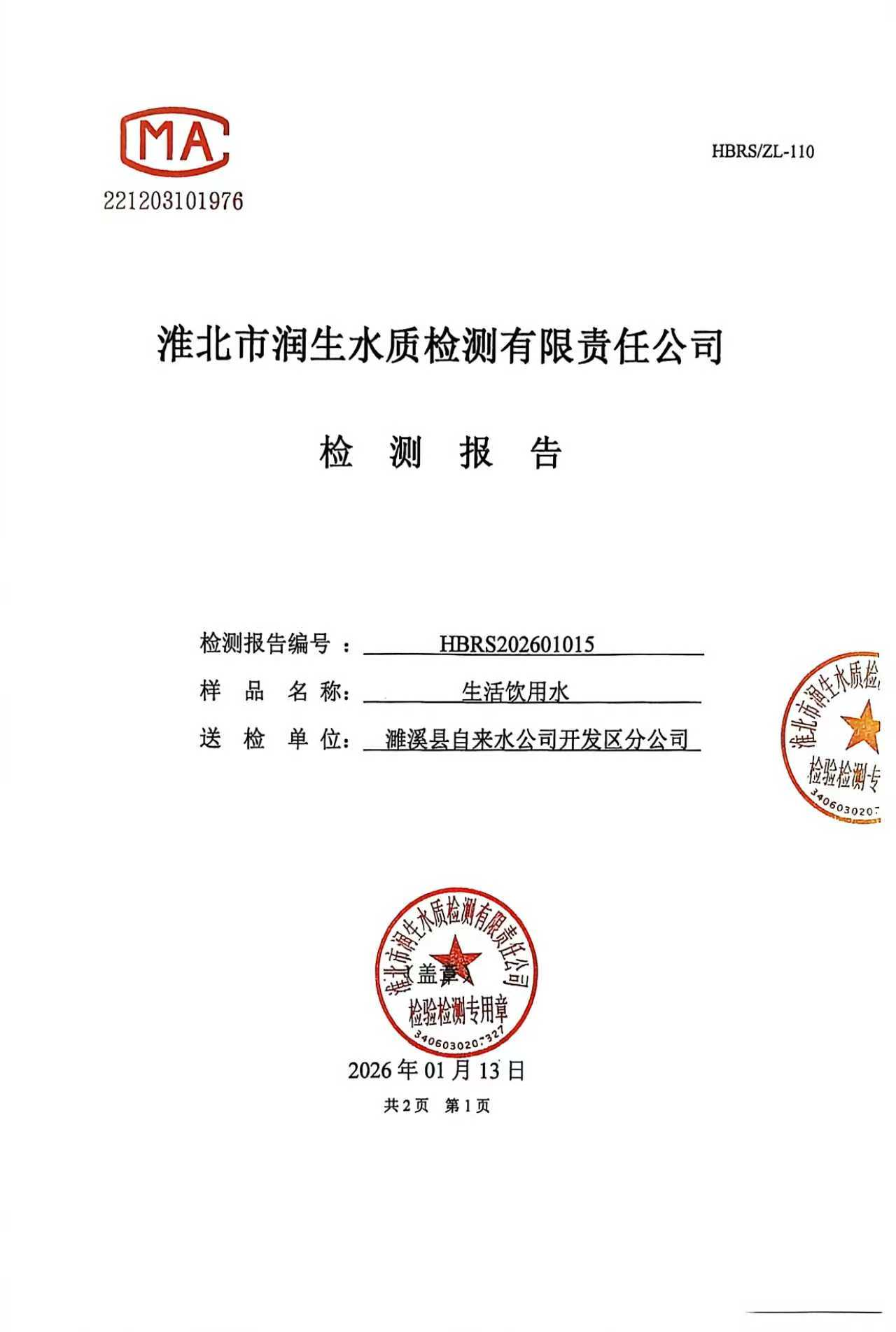 濉溪县自来水公司开发区分公司2026年1月上半月检测报告(管网水)