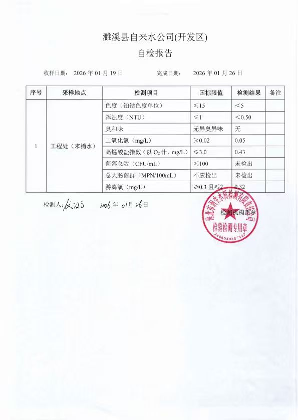 濉溪县自来水公司开发区分公司2026年1月下半月自检报告(管网水)
