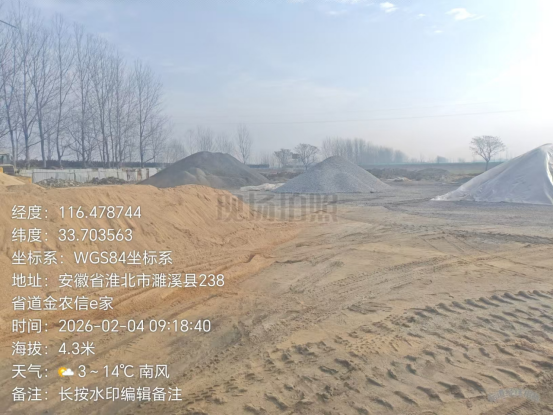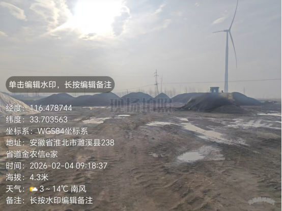 2026年2月4日,濉溪县生态环境分局执法人员联合临涣镇镇环保站工作人员、国土所工作人员对群众反映濉溪县临涣镇238省道收费站西侧料场扬尘污染环境的问题进行现场检查,检查情况如下: