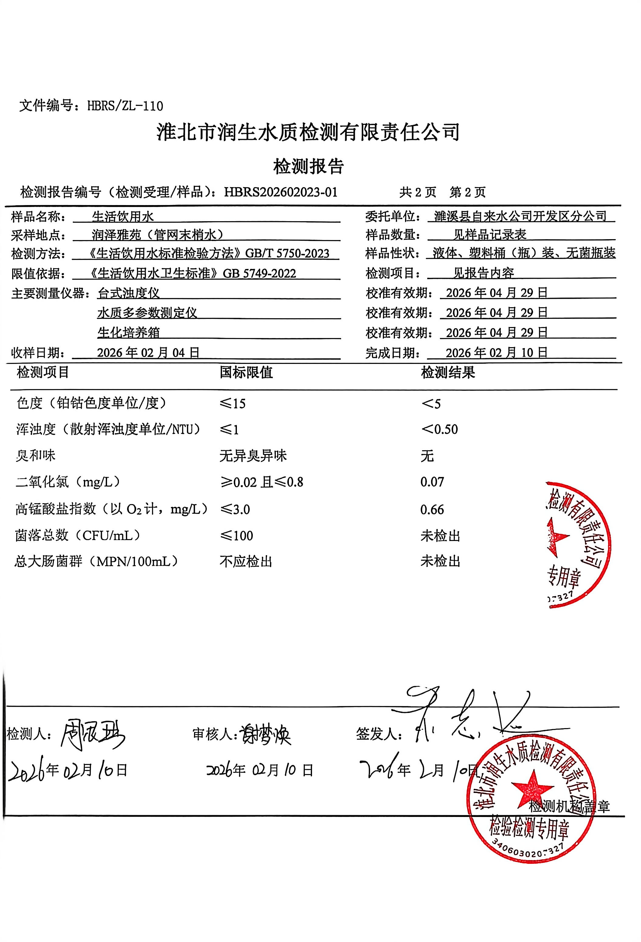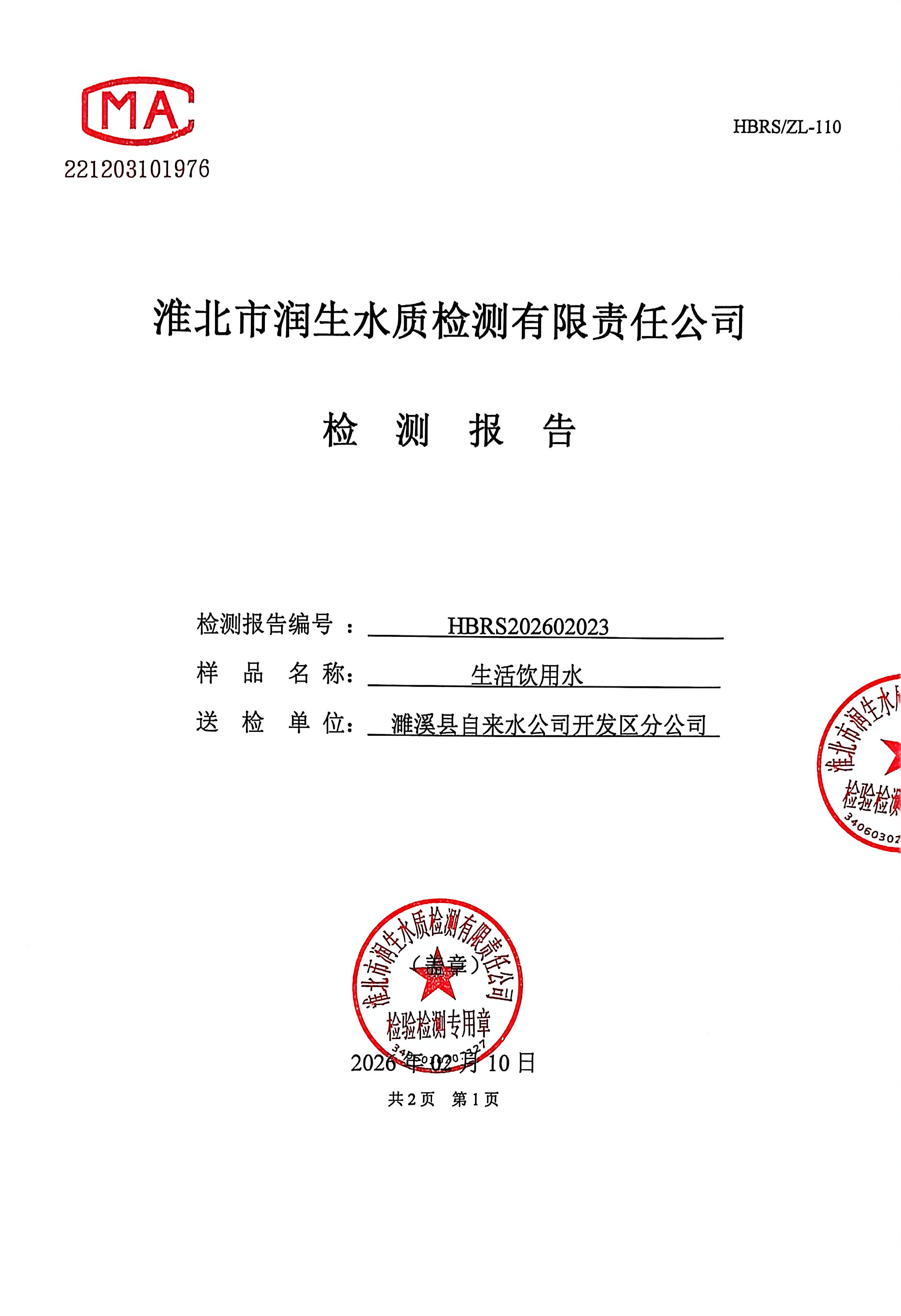 濉溪县自来水公司开发区分公司2026年2月上半月检测报告(管网水)