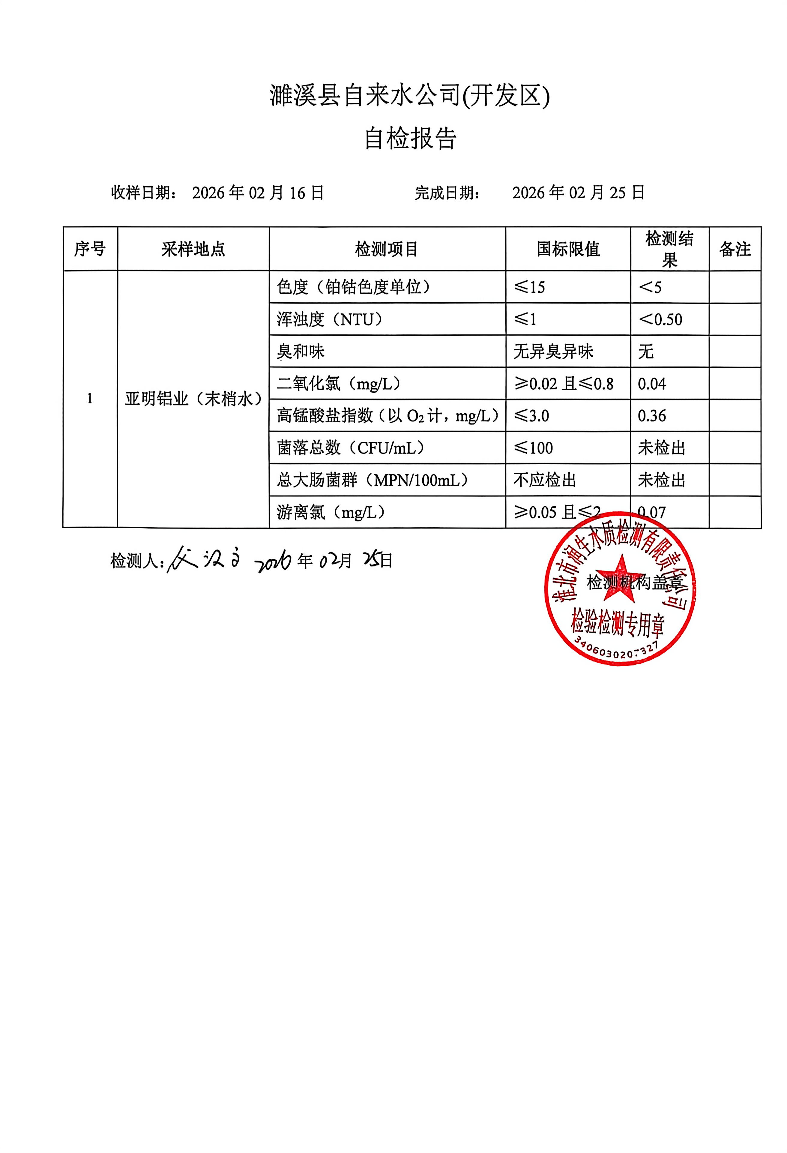 濉溪县自来水公司开发区分公司2026年2月下半月自检报告(管网水)