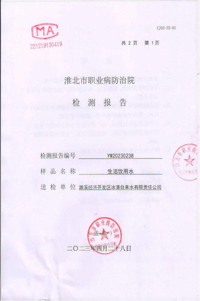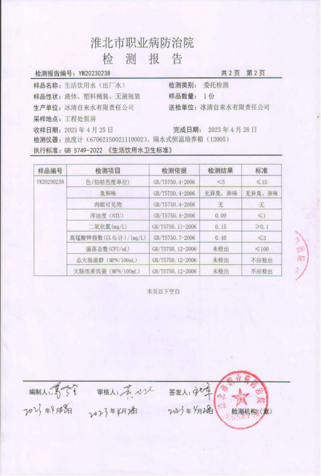 濉溪县冰清自来水公司2023年4月出厂水日检9项指标水质检测报告(4月25日至4月28日)